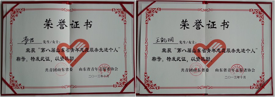 大会还表彰了第八届山东省青年志愿服务先进集体和个人,我校大学生志愿服务西部计划项目管理办公室获得第八届山东省青年志愿服务先进集体称号,我校材料学院学生李浩、经管学院学生王凯润获得第八届山东省青年志愿服务先进个人称号。