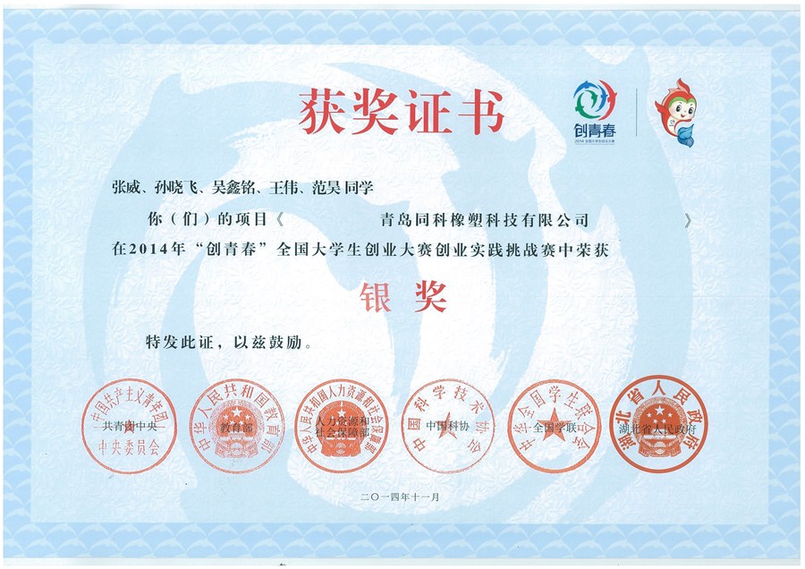 11月4日,由共青团中央、教育部、人力资源和社会保障部、中国科协、全国学联、湖北省人民政府主办,华中科技大学、共青团湖北省委、武汉东湖新技术开发区承办 的2014年“创青春”全国大学生创业大赛终审决赛在华中科技大学落下帷幕。来自全国的创业园区、金融机构、风险投资机构代表,评审专家和参赛师生代表5000余人参加了闭幕式。在本届“创青春”全国大学生创业大赛中,学校共有三个项目获得银奖,分别是:高分子学院王雷、翟静、鲁汇智老师指导的《青岛同科橡塑科技有限公司》(队员:张威、孙晓飞、吴鑫铭、王伟、范昊)荣获创业实践挑战赛银奖;经管学院董华老师指导的《青岛绿桥有限公司创业项目》(队员:高宏昌、周晓、王卫、马俊、李佳佳、刘爱花)获得首届MBA专项赛银奖;信息学院刘晶老师指导的《神农庄园》(队员:李越东、高思远、周子帆、张煜、赵浚浚、曾今)获得移动互联网创业专项赛银奖。