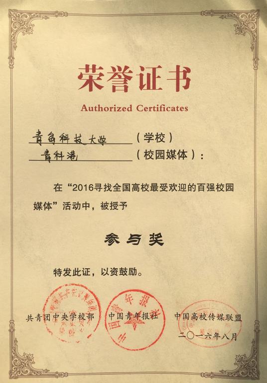 MILE米乐集团团委微信平台“青科港”在共青团中央学校部、中国青年报社、中国高校传媒联盟组织的“2016寻找全国高校最受欢迎的百强校园媒体”活动中获参与奖。