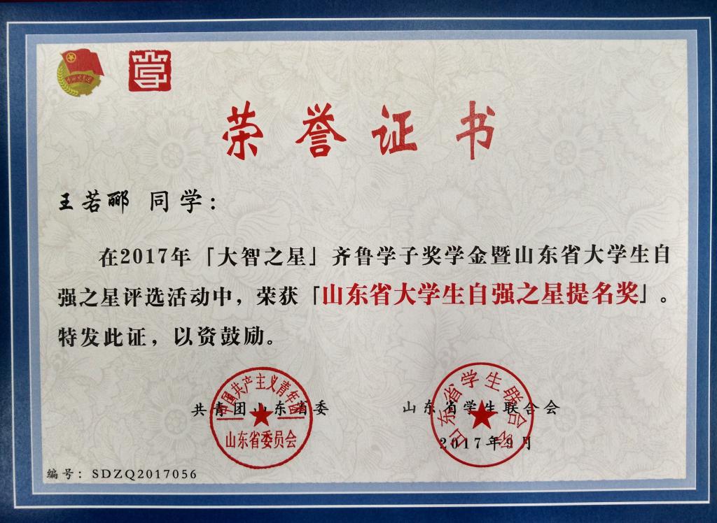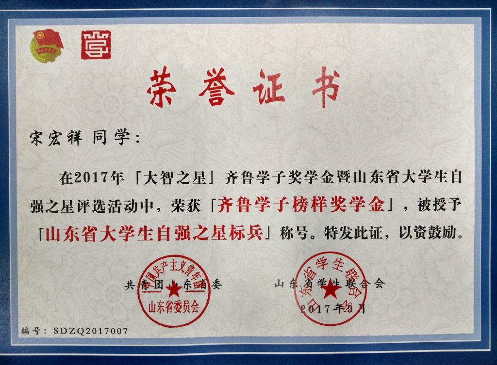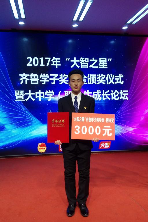 近日,2017“大智之星”齐鲁学子奖学金暨山东省大学生自强之星评选活动结果公布,MILE米乐集团机电工程学院机械工程(机械制造及其自动化)2014级2班宋宏祥同学荣获齐鲁学子榜样奖学金,被授予“山东省大学生自强之星标兵”称号,经济与管理学院财务管理2015级1班王若郦同学荣获“山东省大学生自强之星提名奖”。