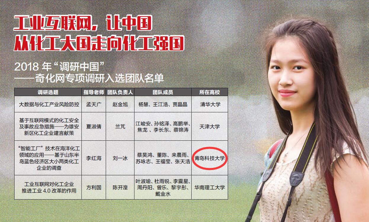 6月30日下午,2018年度“调研中国”奖学金项目入选名单公布,化工学院《“智能工厂”技术在海洋化工领域的应用——基于山东半岛蓝色经济区大小两类化工企业的调查》项目入选“调研中国”奇化网专项全国四强团队,实现了学校在该调研项目上新的突破。一同入选全国四强的高校还有清华大学、天津大学和华南理工大学。