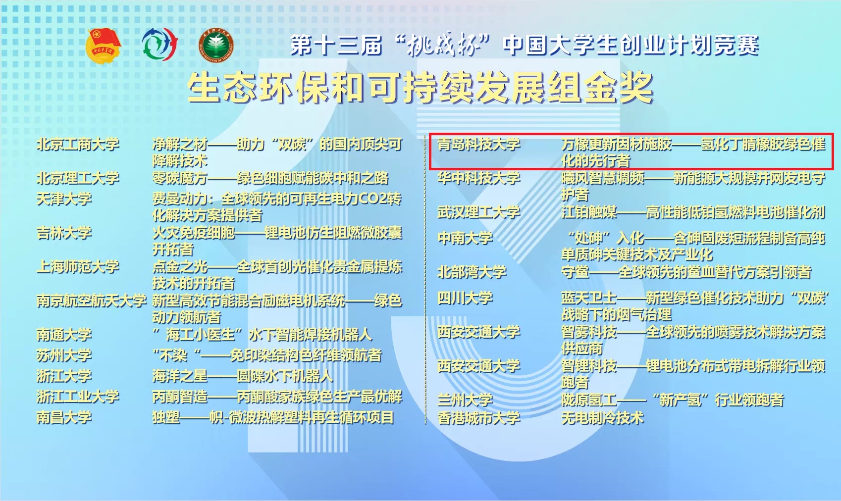 3月17日-19日,第十三届“挑战杯”中国大学生创业计划竞赛全国决赛在北京理工大学举行。本次大赛中,学校共有5个项目入围全国决赛,3个项目进入现场终审答辩,其中《万橡更新因材施胶——氢化丁腈橡胶绿色催化的先行者》(团队负责人:洪子通,第一指导教师:王曼)荣获全国金奖。学校参赛总积分跻身全国前60,成为山东省唯一捧获“优胜杯”的本科高校,实现了赛事重大突破、创造了历史最好成绩!