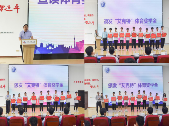 自动化学院院长池荣虎宣读运动会表彰决定,校团委书记毛常明、党委学生工作部副部长曹永俊、安丰波为学生颁发“艾克特”体育奖学金。