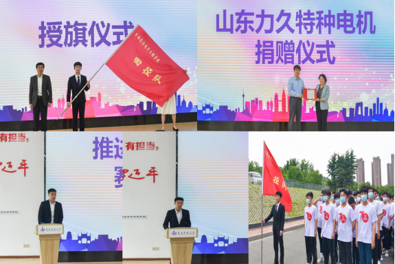 自动化学院党委书记吕德谦为学院田径队授旗,并宣读学院大学生体育综合改革实施方案;教育发展基金会办公室主任王泽鹏为运动会赞助单位——山东力久特种电机股份有限公司颁发捐赠证书。