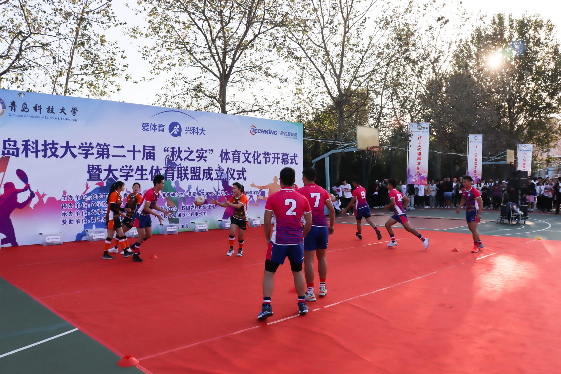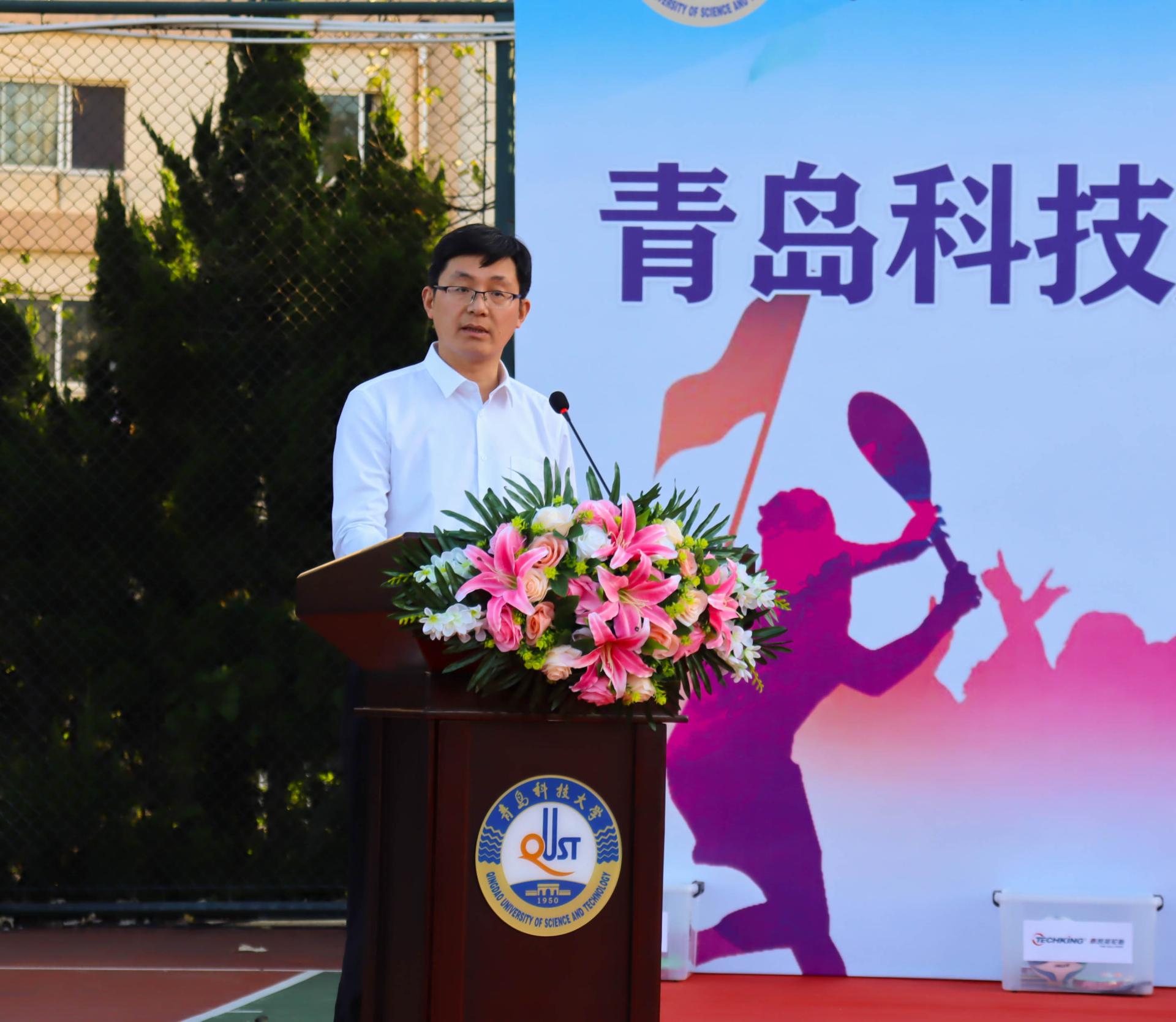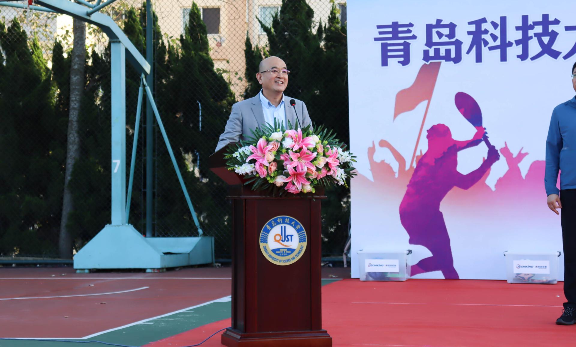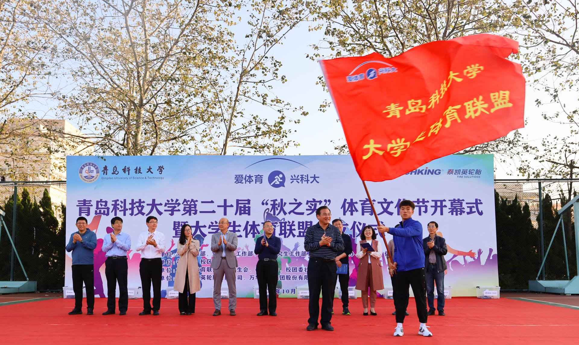 10月12日下午,学校第二十届“秋之实”体育文化节开幕式暨大学生体育联盟成立仪式在崂山校区南苑操场举行,党委常委、副校长丁林,党委常委、宣传部部长陈刚,青岛泰凯英轮胎有限公司董事长兼总裁王传铸、副总裁徐芳出席仪式。