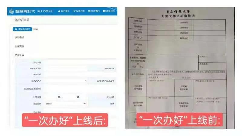 简化一个流程,一次办好有助手。原来办活动申请场地需要到五、六个职能部门签字盖章,校团委通过调研将这一情况上报学校,学校高度重视,协调整合相关部门面向全校师生推出“一次办好”申请场地流程,以后申请活动场地只需要在线上操作即可完成。为方便师生熟悉操作流程,校团委为此专门发布了场地申请流程操作指南。“一次办好”的上线,优化了办事流程,提高了工作效率,让师生在申请场地过程中省心、省时、省力。