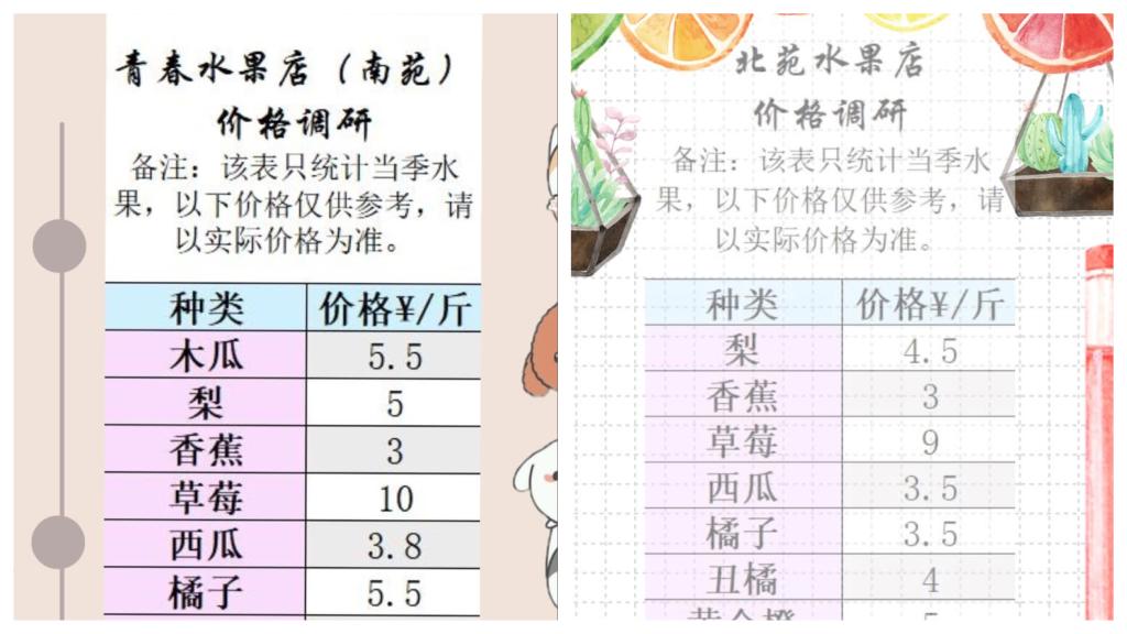 为了更好地方便同学们的生活,青科大学生会从贴近生活从小事做起,从学生切身利益出发,深入调查学校南、北苑水果的价格,让同学们对水果的价格有一个更清晰的了解。便于大家根据自身的需求,吃到自己想吃的水果。