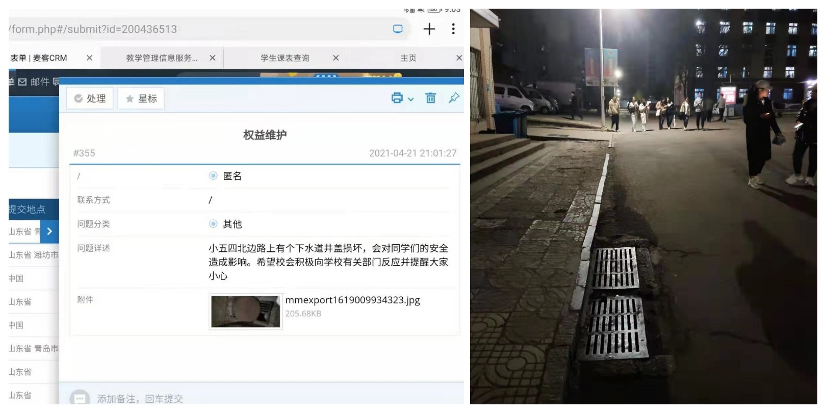 近期,有同学反映出四方校区一教附近的路灯及井盖出现问题并造成安全隐患,校学生会在了解到情况后,立即组织志愿者对井盖出现问题的地方进行标记,并上报相关部门对相关进行处理。目前,报修问题在三天内已经得到解决,为同学们消除了安全隐患。