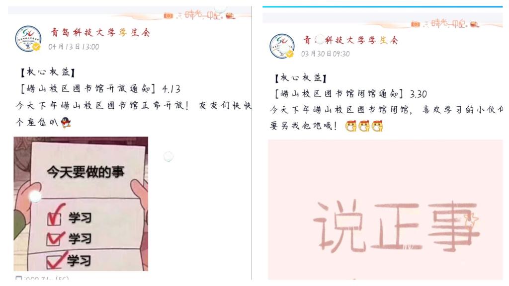 为了更好的让大家利用图书馆,避免因图书馆闭馆而导致的时间浪费。青科大学生会每周都会推送图书馆的开放情况,保证同学们能够第一时间知悉图书馆开闭馆时间,便于大家合理规划时间,进而提高学习效率,养成定期读书的好习惯。