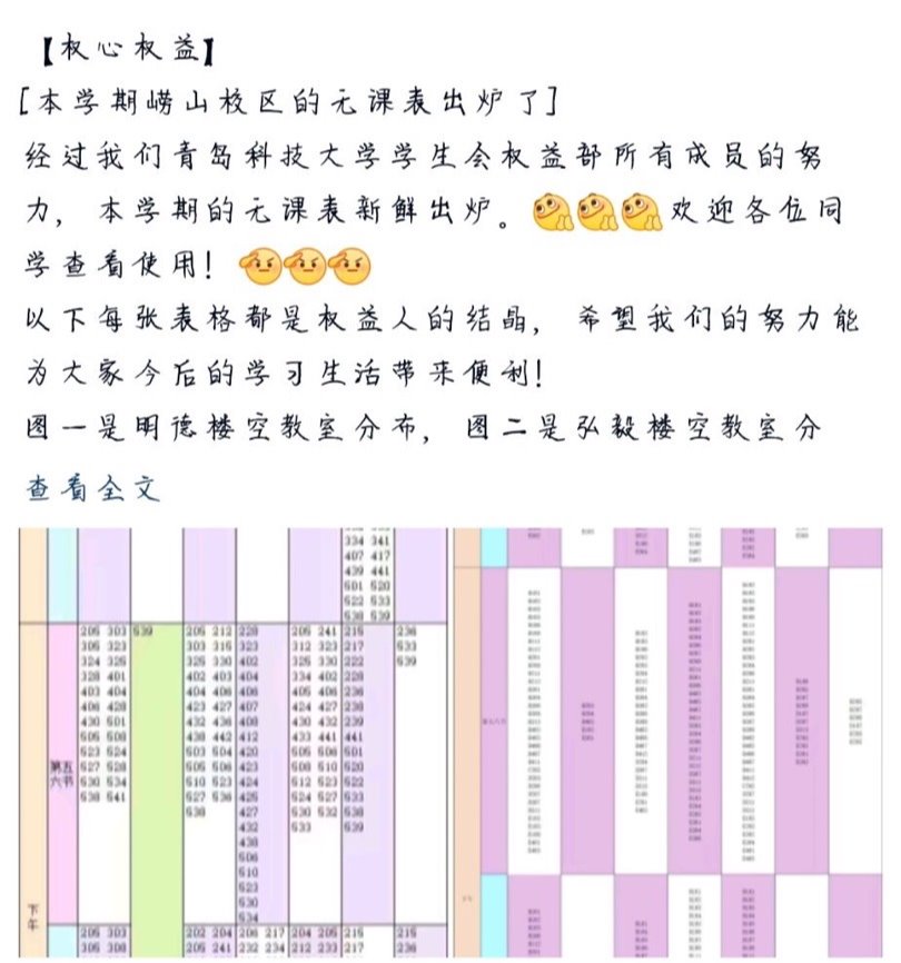 为了让同学们更好地寻找空教室学习,青科大学生会本学期为同学们制作了一张“无课表”,其中将没有课程的空教室按照时间地点进行分类,让同学们直观的就能找到可以学习的空教室,用自己的行动让同学的生活和学习更加便利。