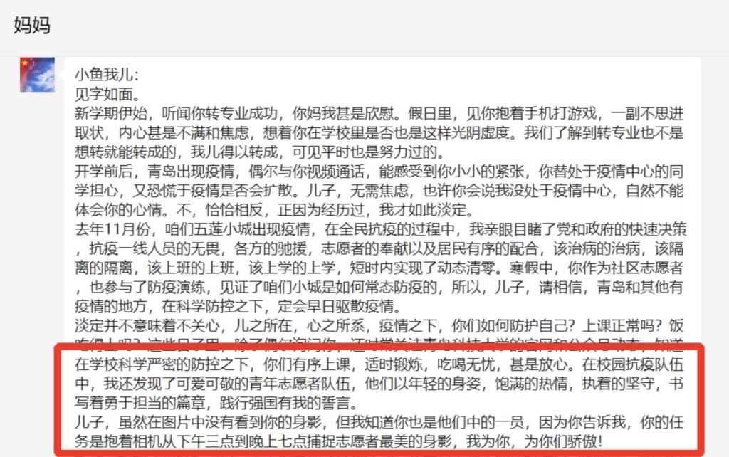 青年媒体工作室的张小鱼同学收到一份来自日照的家书。小鱼的母亲在家书中写到:“儿子,虽然在图片中没有看到你的身影,但我知道你也是他们中的一员,因为你告诉我,你的任务是抱着相机从下午三点到晚上七点捕捉志愿者最美的身影,我为你、为你们骄傲!”