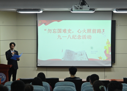 9月18日,自动化学院于学院楼410会议室举办纪念九一八事变91周年主题教育活动。2021级青年学生张高宁带领在场全体团员青年重温九一八事变的历史和革命烈士的伟大事迹,号召青年学生“勿忘国耻、奋发图强、砥砺前行”。