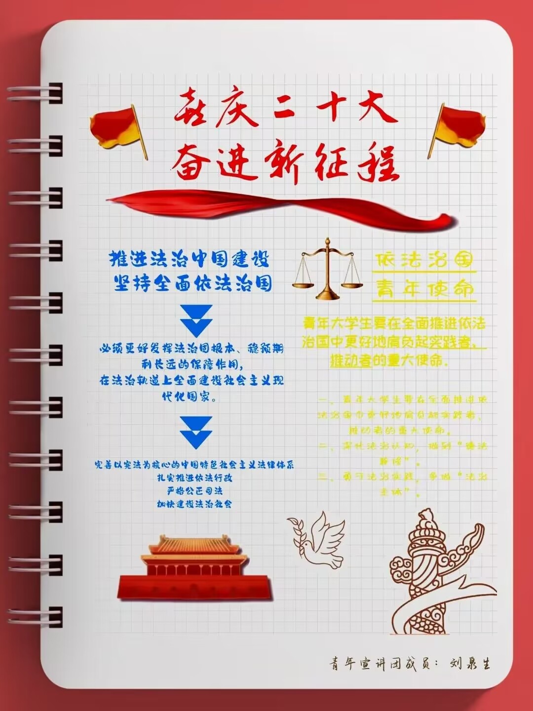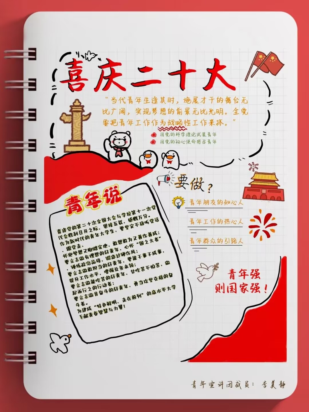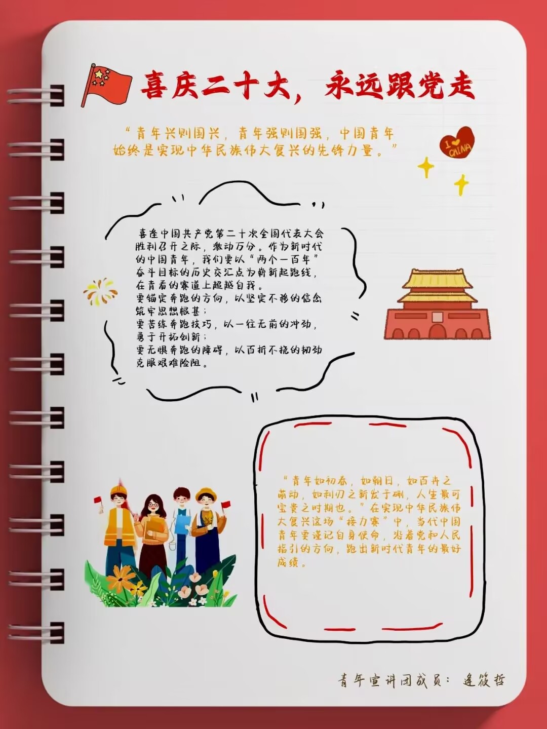“青年强,则国家强”青年一代必须树立远大理想追求以科学理论武装自己的头脑为了推动党的二十大精神入脑入心学校青年宣讲团成员当好宣传员用手帐的方式表达对党的热爱献礼二十大