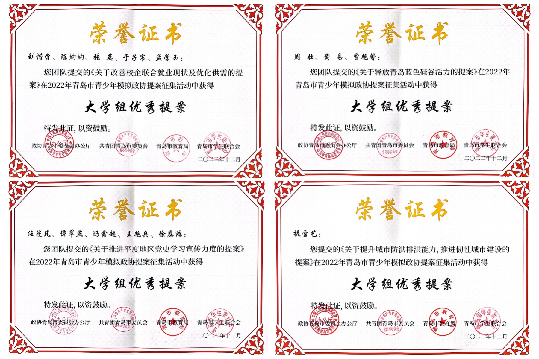 日前,由青岛市政协办公厅、青岛团市委、青岛市教育局和青岛市学联联合举办的青岛市青少年模拟政协提案征集活动落下帷幕,我校4件作品荣获“大学组优秀提案”,5名老师获评“优秀指导教师”。