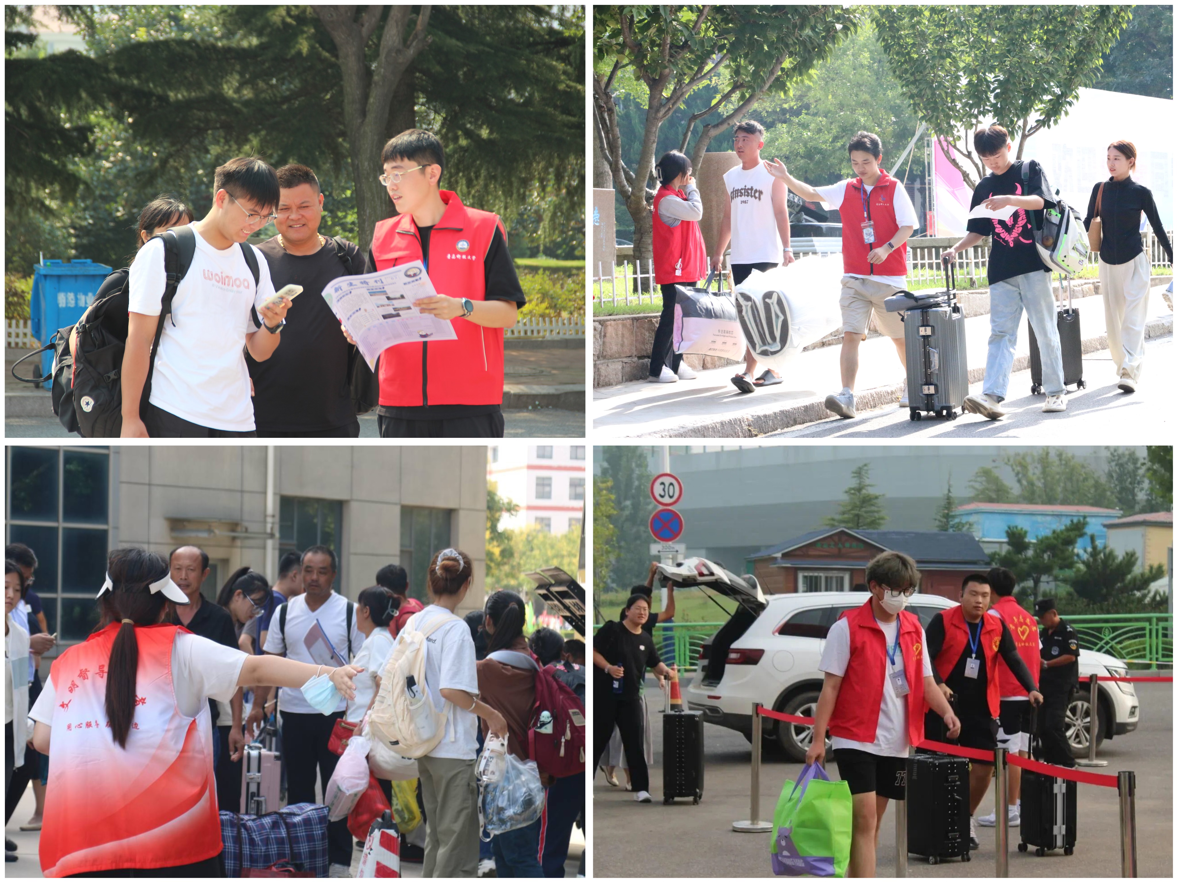 迎新志愿服务现场,清晨6:00至晚上12:00不断线的“志愿红”,在青科大的校园内构筑起迎新服务的最美风景线。校团委、校学生会、校研究生会分别在崂山、四方两校区门口处,设立“骨干先锋岗”,划分布置学院迎新点,帮助车辆进行快速分流,切实把好“第一公里”。在校园内主要干道和宿舍楼下,设立“共青团、学生会志愿服务驿站”,根据学院宿舍划分志愿服务区域,实行“包片管理”;开放两校区团学阵地为新生及家长提供休息场地,分校区设计制作并累计发放新生特刊10100份,四校区新生“人手一份”,新生入校实现“一刊全通”,切实守好“最后一公里”。