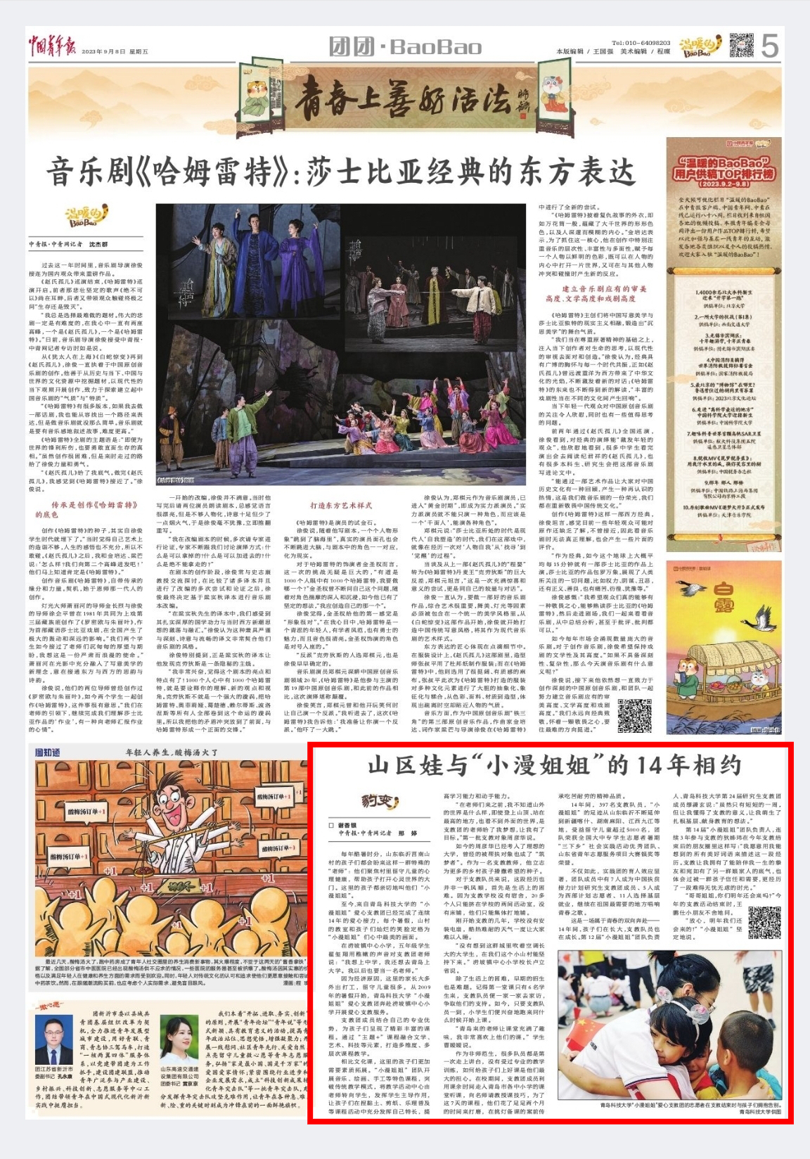 9月8日,《中国青年报》(第五版)以《山区娃与“小漫姐姐”的14年相约》为题,深度报道我校实践育人典型案例。中国青年报客户端以视频报道的形式,就MILE米乐集团“小漫姐姐”志愿服务队进行全方位展示。此次报道,充分展示了学校共青团推动社会实践品牌化、志愿服务项目化的实践成果,也是学校共青团坚持落实“立德树人”根本任务,着力构建社会实践“双循环”融入“五育并举”“三全育人”大格局的生动体现。
