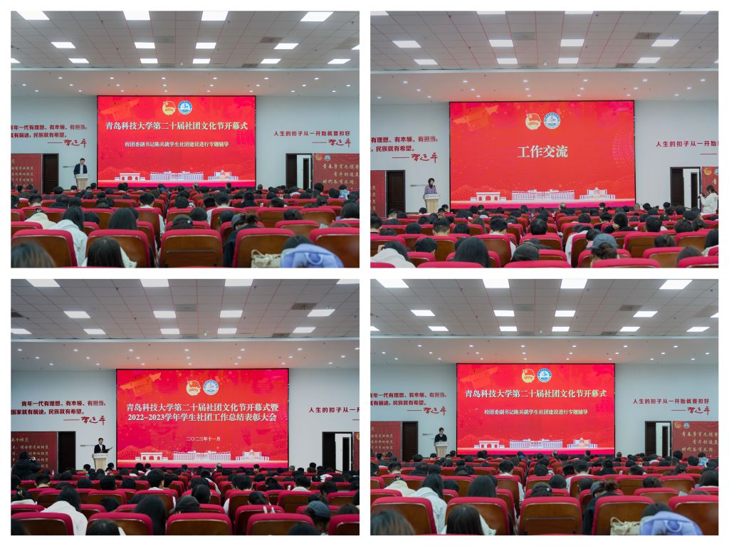 11月14日,学校第二十届社团文化节开幕式暨2022-2023学年学生社团工作总结表彰大会在崂山校区北区团学报告厅成功举办。党委常委、副校长丁林,党委常委、宣传部部长张洪坤出席会议;党委学生工作部、校团委负责人,院级党组织负责人代表,各学院团委书记、学生社团工作负责人,全校学生社团指导教师代表、学生社团负责人及会员代表,校团委社团管理部学生骨干等450余人参加本次活动。