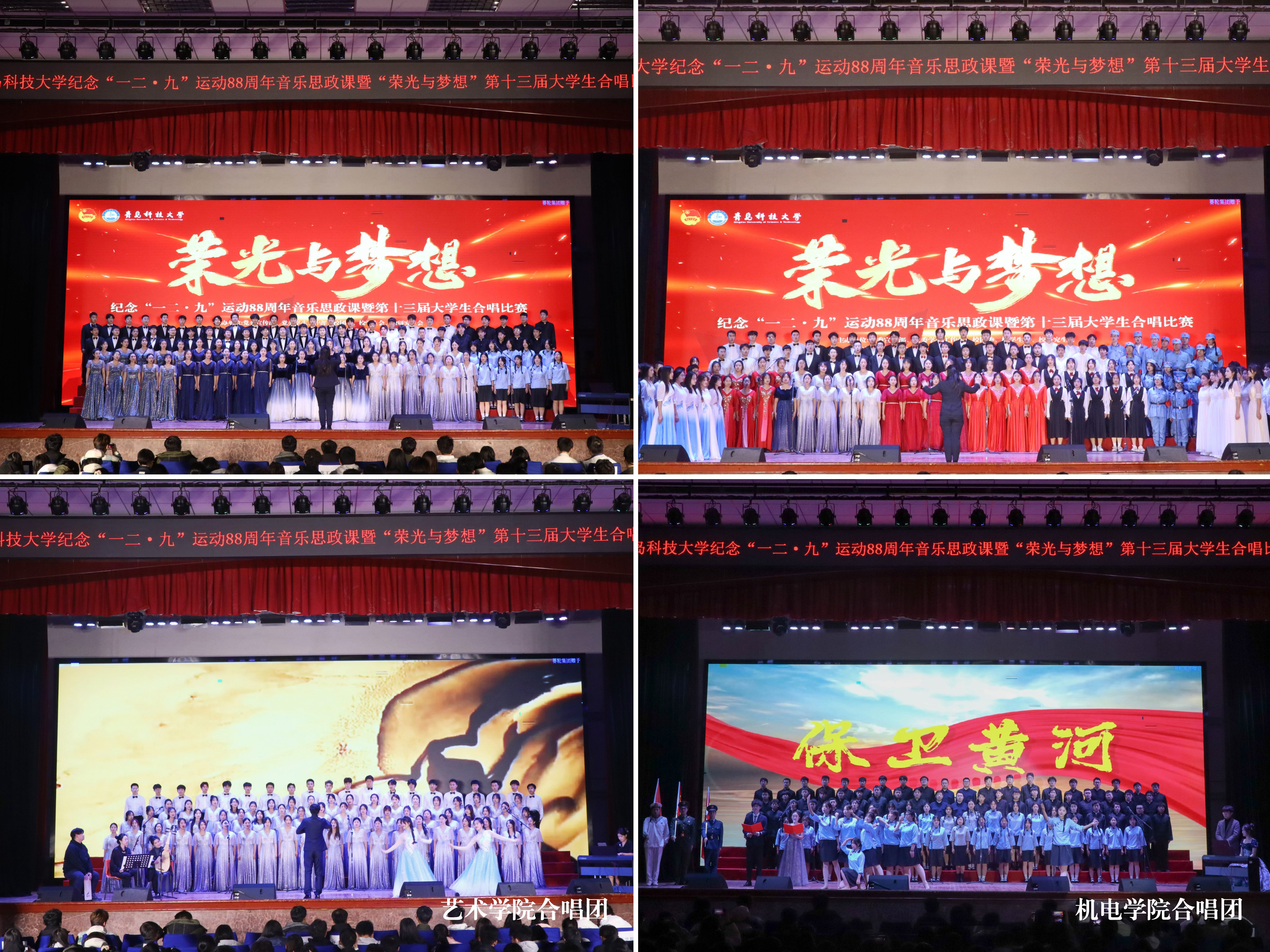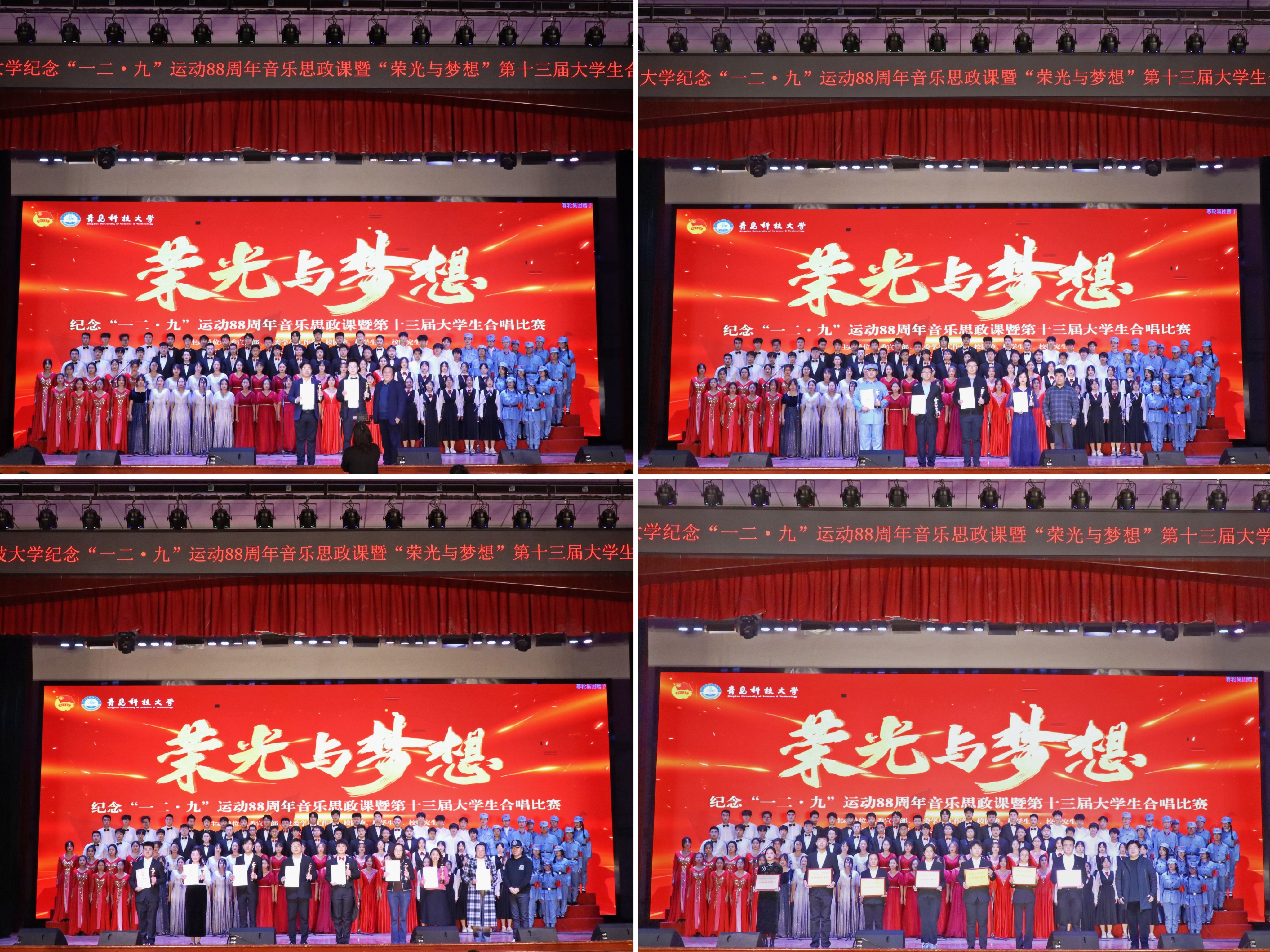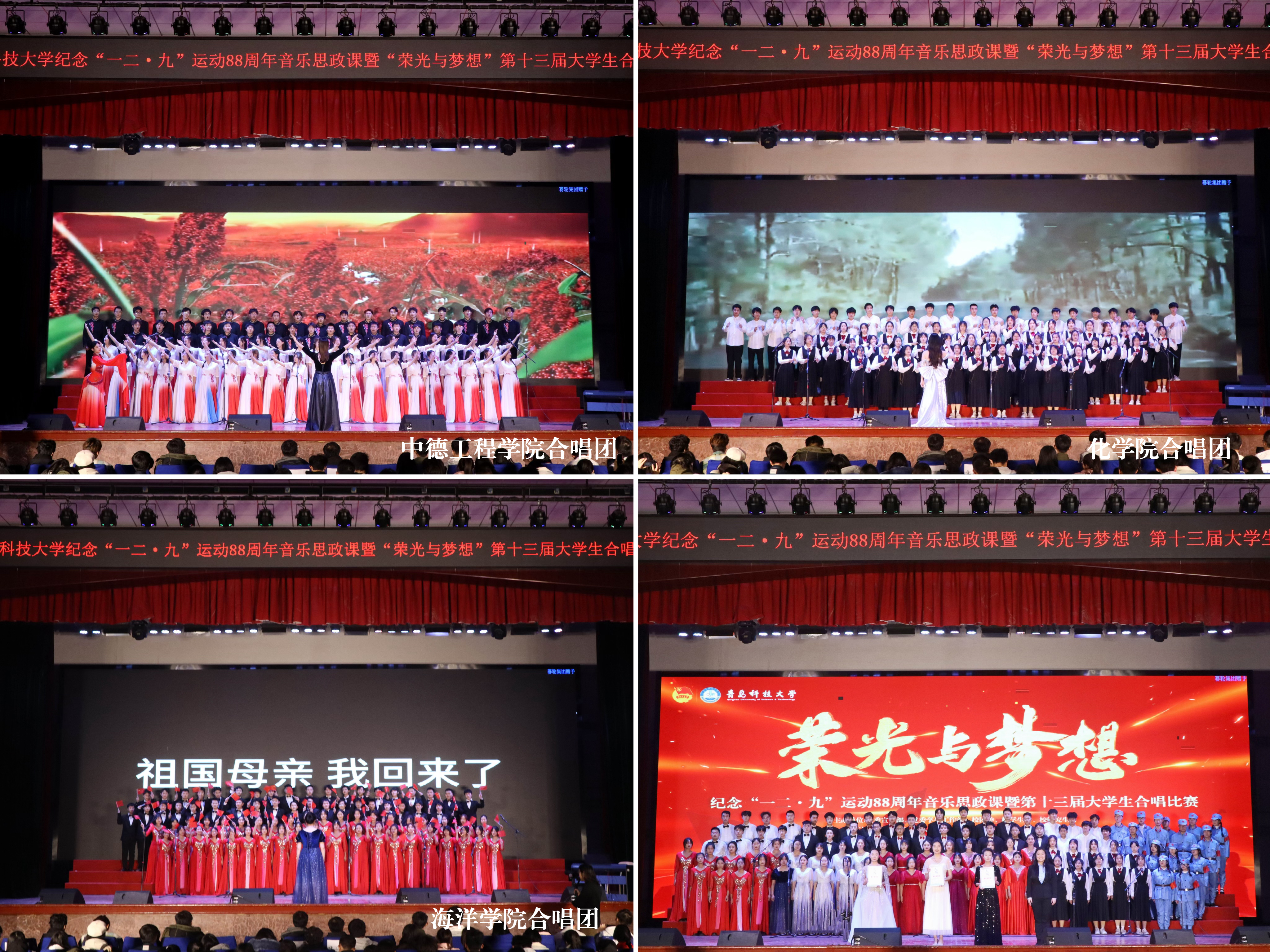 总决赛现场,来自崂山、四方、高密三校区和中德工程学院的13支队伍,通过演唱《走向复兴》《四渡赤水出奇兵》《七子之歌》《保卫黄河》等曲目,讲述中国共产党领导全国人民筚路蓝缕、艰苦奋斗的光辉历程;通过演唱《我和我的祖国》《国家》《灯火里的中国》等曲目,展现当今盛世中国安定繁荣、国泰民安的发展景象;通过演唱《光亮》《星辰大海》《平凡之路》等曲目,表达新时代科大青年追求卓越、奔赴荣光的青春理想。各学院(校区)合唱队精神饱满、昂扬奋进,用嘹亮的歌声唱响了新时代科大青年的爱党爱国爱校之情,并结合朗诵、情景剧、舞蹈等艺术形式,让艺术之美赋能音乐思政课堂,为全校青年学生带来一堂沉浸式音乐思政大课。