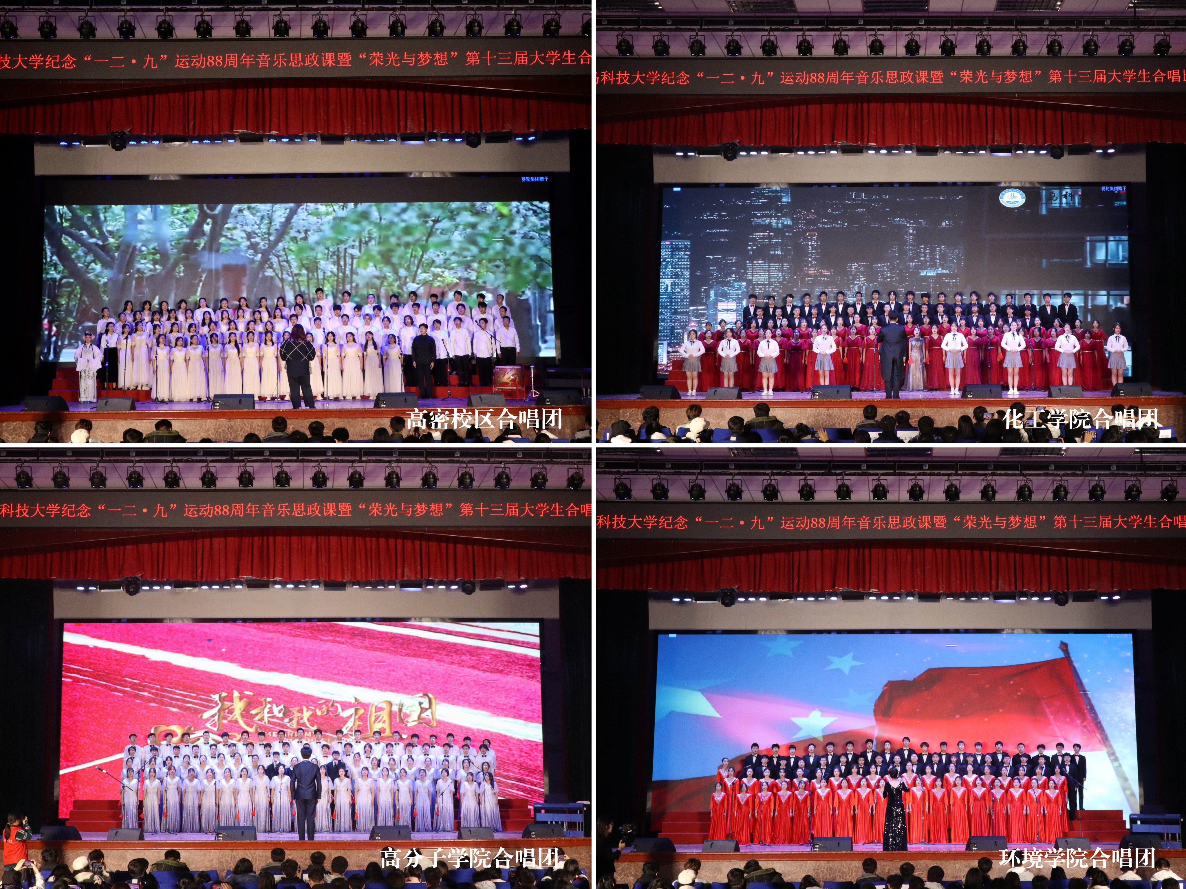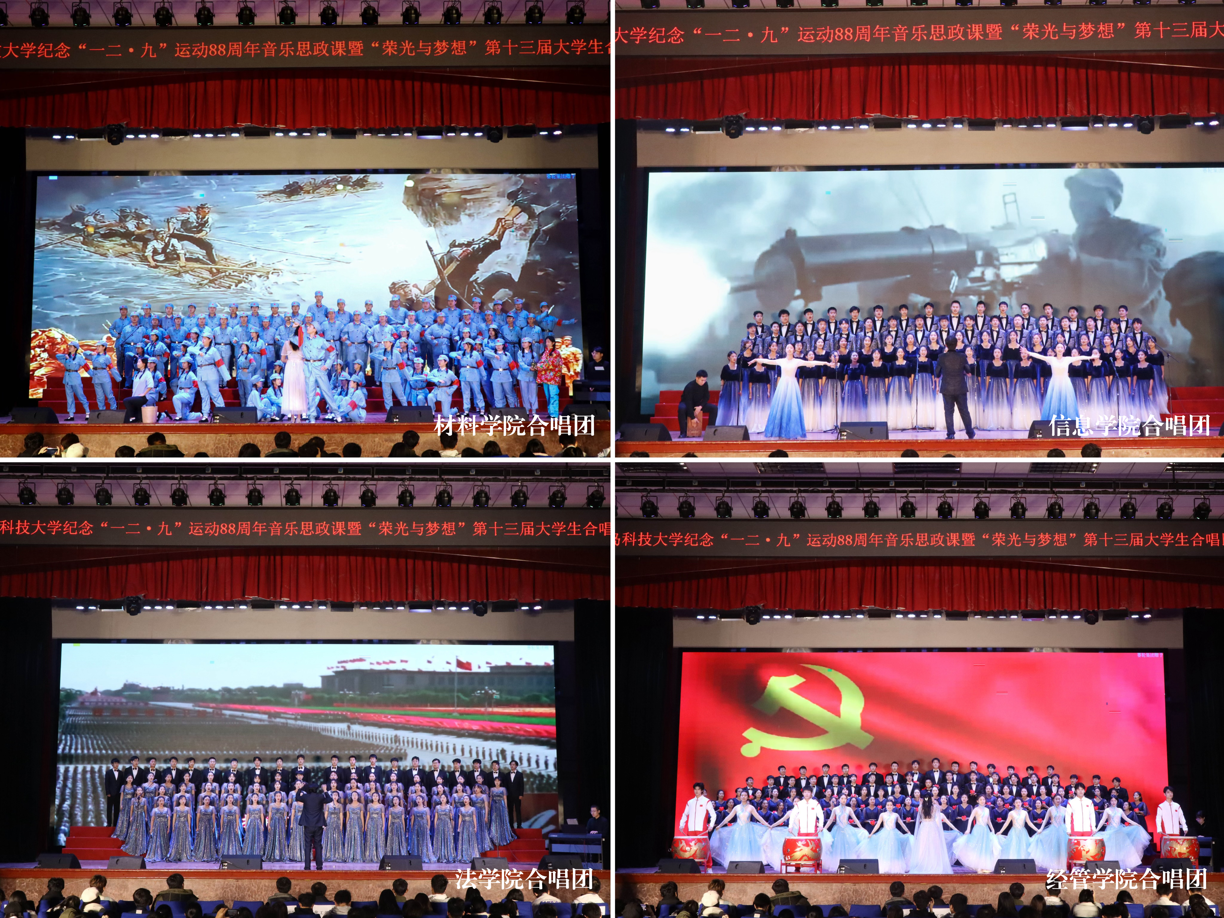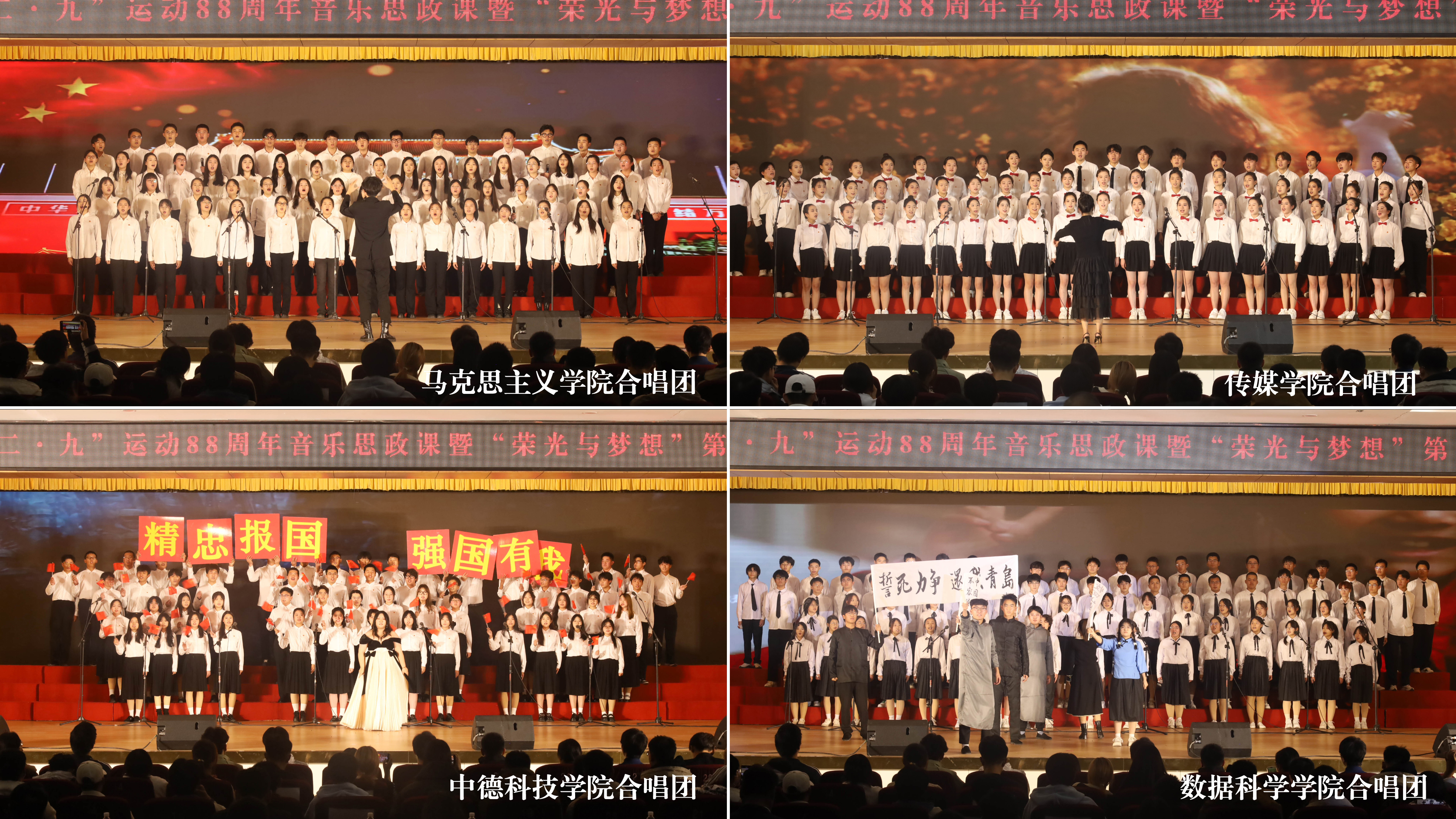总决赛现场,来自崂山、四方、高密三校区和中德工程学院的13支队伍,通过演唱《走向复兴》《四渡赤水出奇兵》《七子之歌》《保卫黄河》等曲目,讲述中国共产党领导全国人民筚路蓝缕、艰苦奋斗的光辉历程;通过演唱《我和我的祖国》《国家》《灯火里的中国》等曲目,展现当今盛世中国安定繁荣、国泰民安的发展景象;通过演唱《光亮》《星辰大海》《平凡之路》等曲目,表达新时代科大青年追求卓越、奔赴荣光的青春理想。各学院(校区)合唱队精神饱满、昂扬奋进,用嘹亮的歌声唱响了新时代科大青年的爱党爱国爱校之情,并结合朗诵、情景剧、舞蹈等艺术形式,让艺术之美赋能音乐思政课堂,为全校青年学生带来一堂沉浸式音乐思政大课。