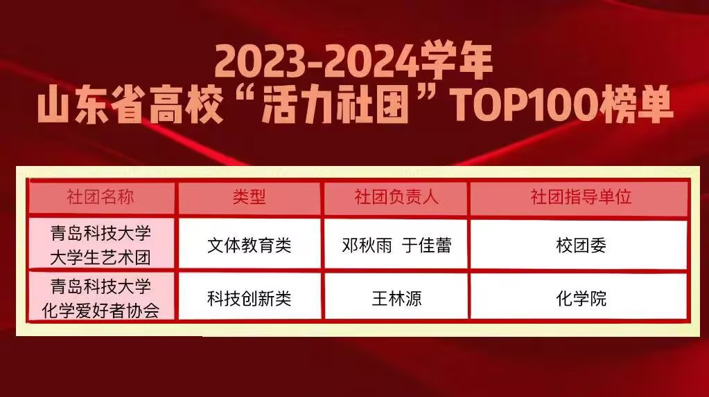 近日,在团山东省委学校部、山东省学生联合会开展的2023—2024学年高校“活力社团”风采展示活动中,学校大学生艺术团、化学爱好者协会入选2023—2024学年山东省高校“活力社团”TOP100榜单。