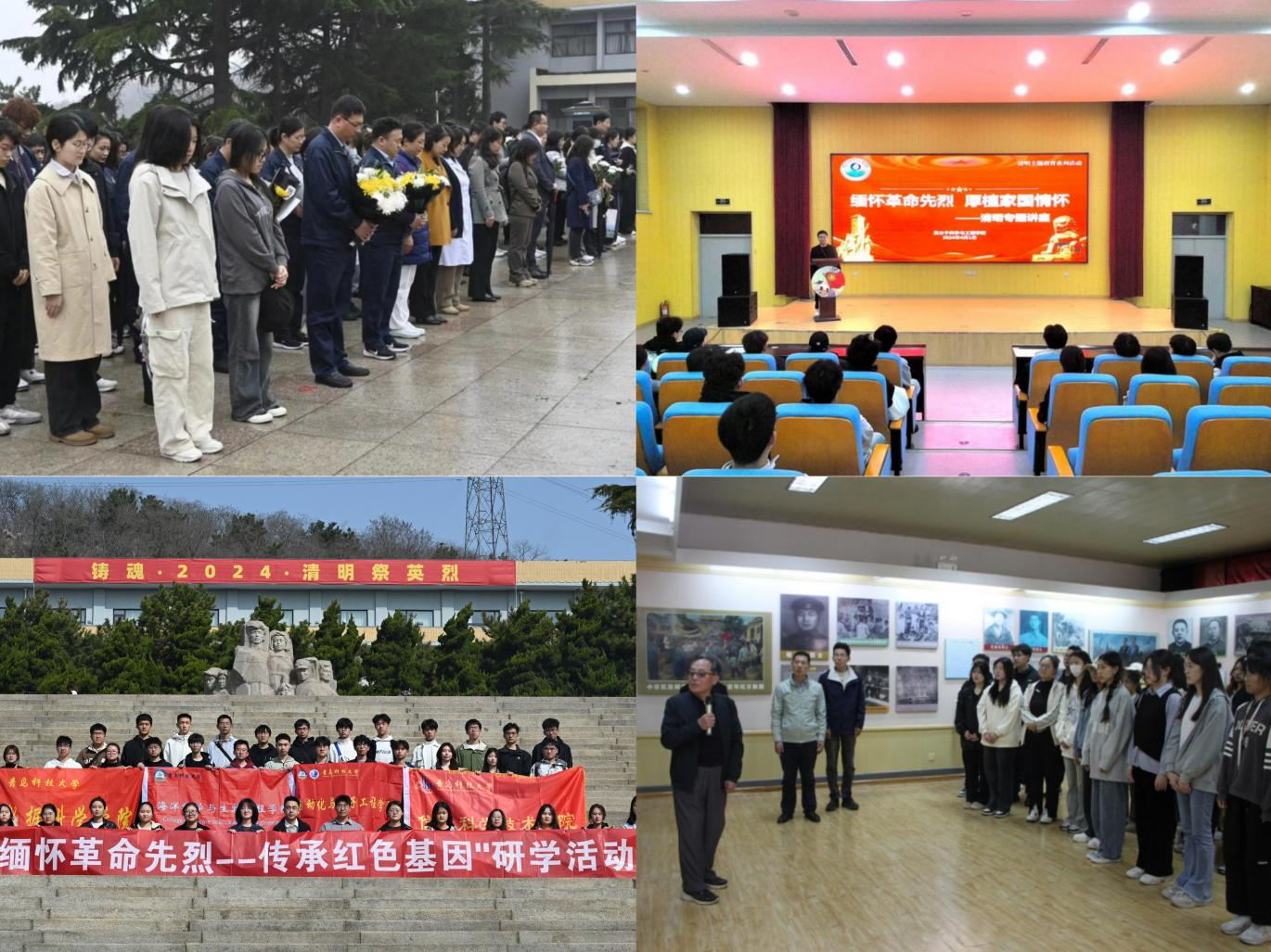 校团委、校学生会、研究会组织青年学生前往青岛烈士陵园与革命烈士纪念馆祭扫,参观研学抗战纪念馆,向英勇牺牲的英雄烈士默哀,深刻感受到革命先烈们英勇无畏的伟大精神。化工学院团委组织各团支部依托红色观影、线上祭扫、专题学习、交流分享会等多种形式开展“缅英烈,追思扬魂”主题团课,重温红色经典,赓续红色基因,汲取前进的智慧和力量。自动化学院团委、海洋学院团委开展“缅怀革命先烈,传承红色基因”研学活动,组织学生走进青岛市革命烈士纪念馆,在仪式熏陶、沉浸式情景和实践活动中引导学生铭记革命历史,传承红色基因。中德工程学院团委组织全体学生骨干前往黄岛烈士陵园,观看英烈事迹,瞻仰英雄纪念碑,以默哀、献花表达对革命烈士的无限敬意。马克思主义学院团总支举办“铸魂·2024·清明祭英烈”线上祭扫活动,组织学生缅怀革命先烈与仁人志士,追思先烈为国为民的高尚情怀,表达对革命先烈的敬仰与追思之情。传媒学院团委组织学生观看红色电影,追忆红色历史,回顾中华民族奋斗历程,缅怀革命先烈不屈的精神,引导同学们不忘历史,坚守初心。中德科技学院团委开展“缅怀先烈,崇尚英雄”事迹分享会,组织同学们分享先烈故事,抒发学习感悟,引导青年学生铭记英雄故事,传承先烈精神。法学院团委组织“常青藤”理论学习小组开展“传承先烈精神,奋进新时代”清明主题理论学习,讲述先烈事迹,学习英雄精神。机电工程学院团委组织开展英烈精神专题学习会,引导广大团员青年铭记历史,以尊崇之心珍视和平、以民族之力矢志复兴,在新时代砥砺新担当、展现新作为。高密校区团委组织青年代表团前往烈士纪念馆,聆听高密市党史宣传员宋群讲述烈士宋国瑞的红色故事,追思革命先烈,探寻英烈足迹,上好“行走的思政课”。