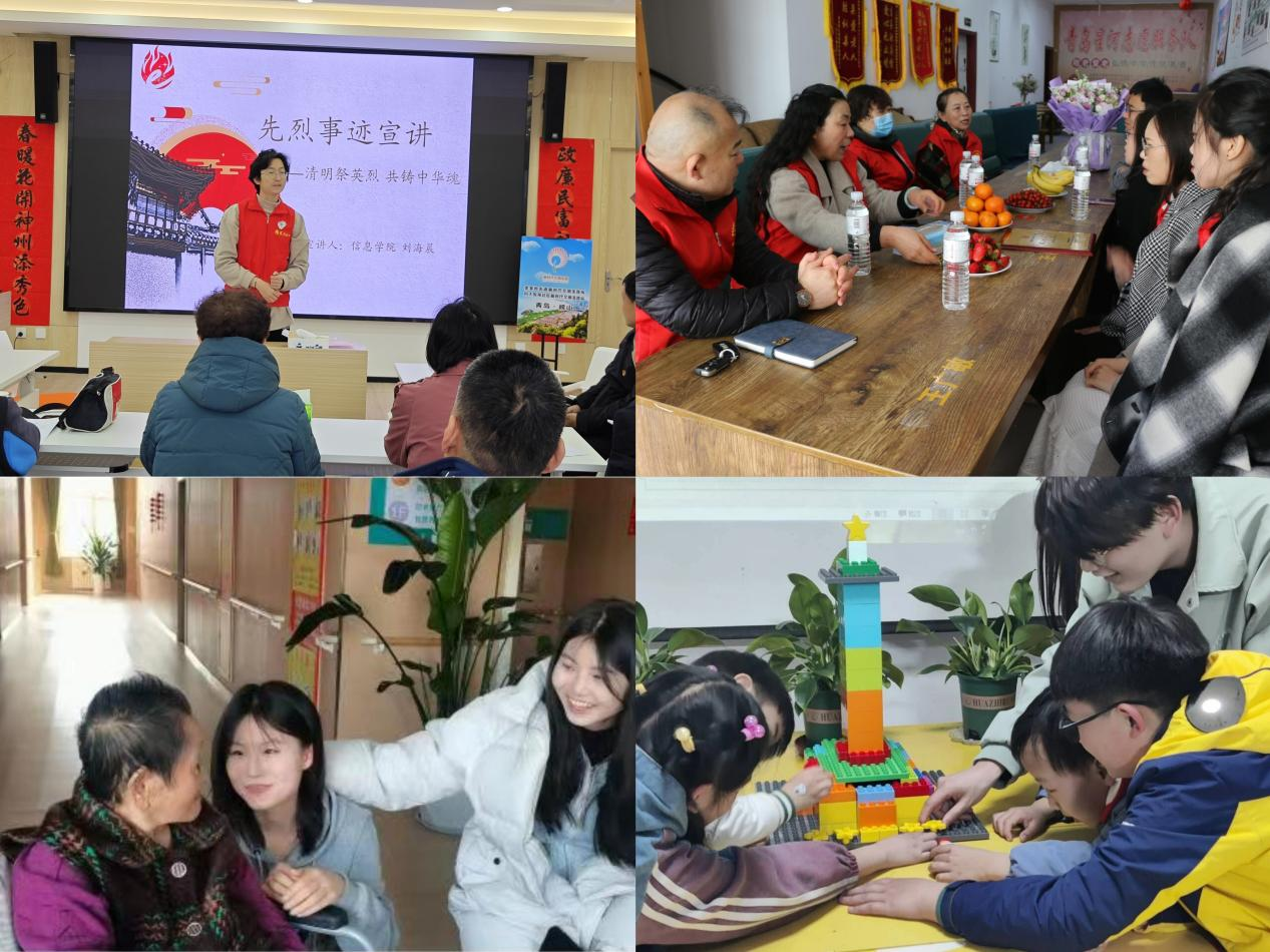 信息学院团委组织星火“e+”学生志愿者在科大悦苑社区开展“先烈事迹”宣讲活动,志愿者与群众居民共同交流先烈事迹,向社区群众讲述文明祭祀的相关规范要求,倡导文明祭祀。法学院团委组织团支部深入养老机构和小学开展“老少共融暖心行”活动,走进万林居家社区养老服务中心,开展“话岁月,暖心谈”围坐访谈、“悦舞伴老,歌声传情”大舞台,“思维跃动,益智同行”小游戏等活动,与老年人面对面接触、心对心交流。数理学院团委开展清明志愿服务实践活动,组织团员青年赴市南区与青岛最佳志愿服务组织星河志愿服务队开展共建交流,带领青年深耕社区,树文明新风,展青年担当。环境学院团委组织青年学生代表前往市北区阜阳路社区开展面向社区儿童的清明节主题宣讲活动,为小朋友们介绍清明节文化习俗,讲述革命先烈英勇事迹和感人故事,传承红色文化、赓续红色血脉。