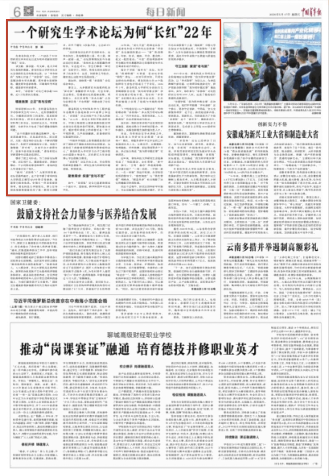 5月17日,《中国青年报》(第六版)刊发文章《一个研究生学术论坛为何“长红”22年》,深入报道我校“求思得”论坛创新案例。文章介绍了我校围绕立德树人根本任务,从“求思得”论坛创办初心,聚焦需求与时俱进,到为老品牌赋予新内涵,获评首届全国学联“我为同学做实事”精品项目的历程进行细致梳理,厘清“求思得”论坛“长红”22年的根本原因,受到广泛关注。