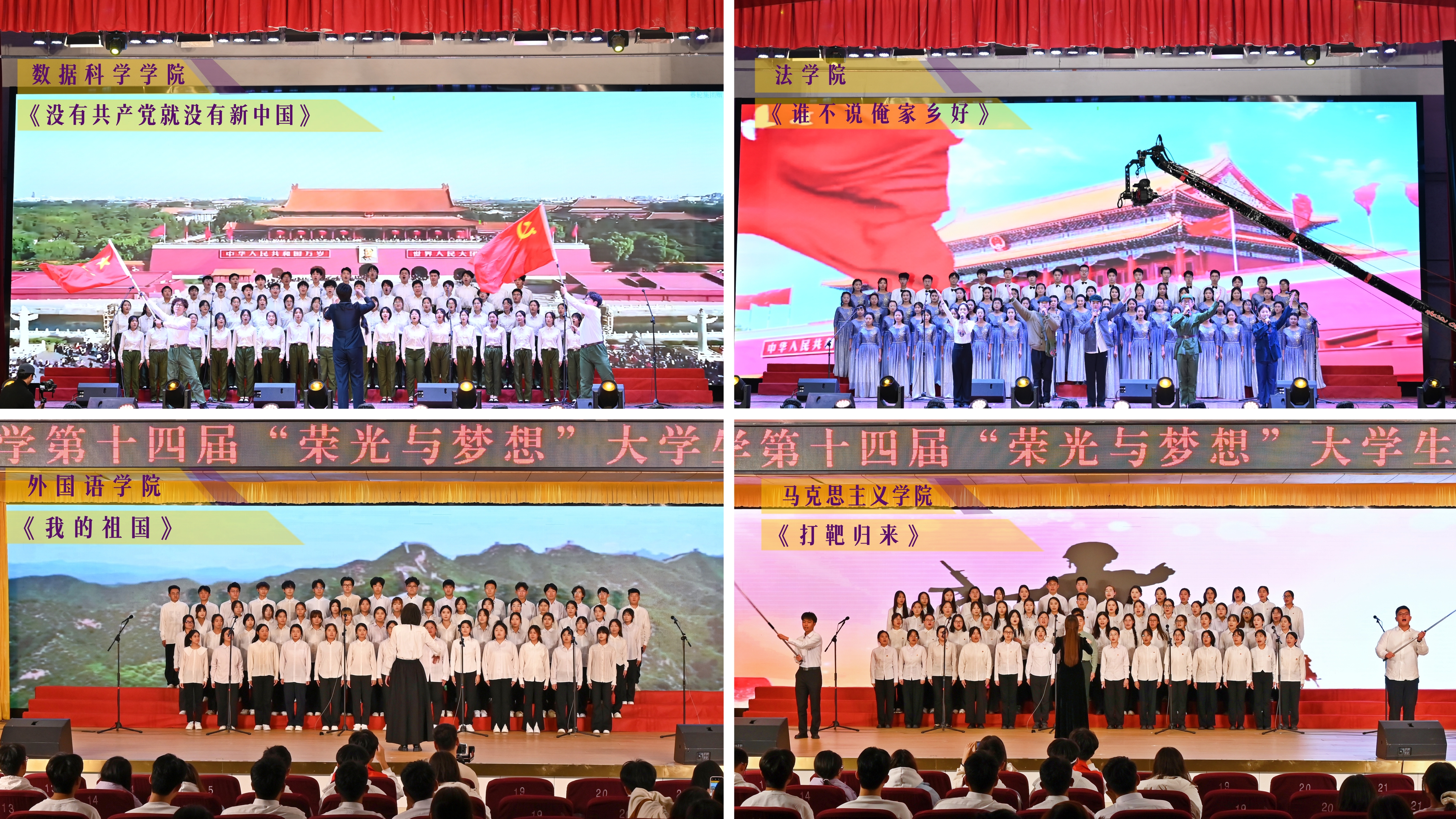 决赛在校歌《青春校园》的跃动旋律中开场,各支队伍通过演唱《在太行山上》《旗正飘飘》《映山红》《南泥湾》《保卫黄河》等曲目,在激昂的歌声中带领现场观众穿越时空,回到那个激情澎湃、英雄辈出的年代;通过演唱《我们走在大路上》《唱支山歌给党听》《没有共产党就没有新中国》《谁不说俺家乡好》《我的祖国》《打靶归来》等曲目,展现了新中国成立后,全国各族人民在中国共产党的领导下,自力更生、发愤图强,以实际行动投身于社会主义建设的壮丽篇章;通过演唱《祖国不会忘记》《年轻的朋友来相会》《在灿烂的阳光下》《国家》《春天的故事》等曲目,讴歌了改革开放以来,我国经济社会发展取得的辉煌成就,唱响了春风化雨润沧桑的时代风采;通过演唱《有我》《灯火里的中国》《平凡之路》《如愿》《星辰大海》等曲目,展现出中华民族团结奋斗、昂扬进取的精神风貌,青年学生共同许下“请党放心、强国有我”的青春誓言。最后,在全场齐声高唱《光荣啊,中国共青团》的热烈气氛中,比赛圆满落幕。各学院(校区)合唱队以动人旋律咏唱恢宏史诗,以深情乐章礼赞伟大时代,雄浑的气势、激情的表演激荡着全场青年师生的爱国情怀,呈现出一堂“沉浸式”的音乐思政大课。