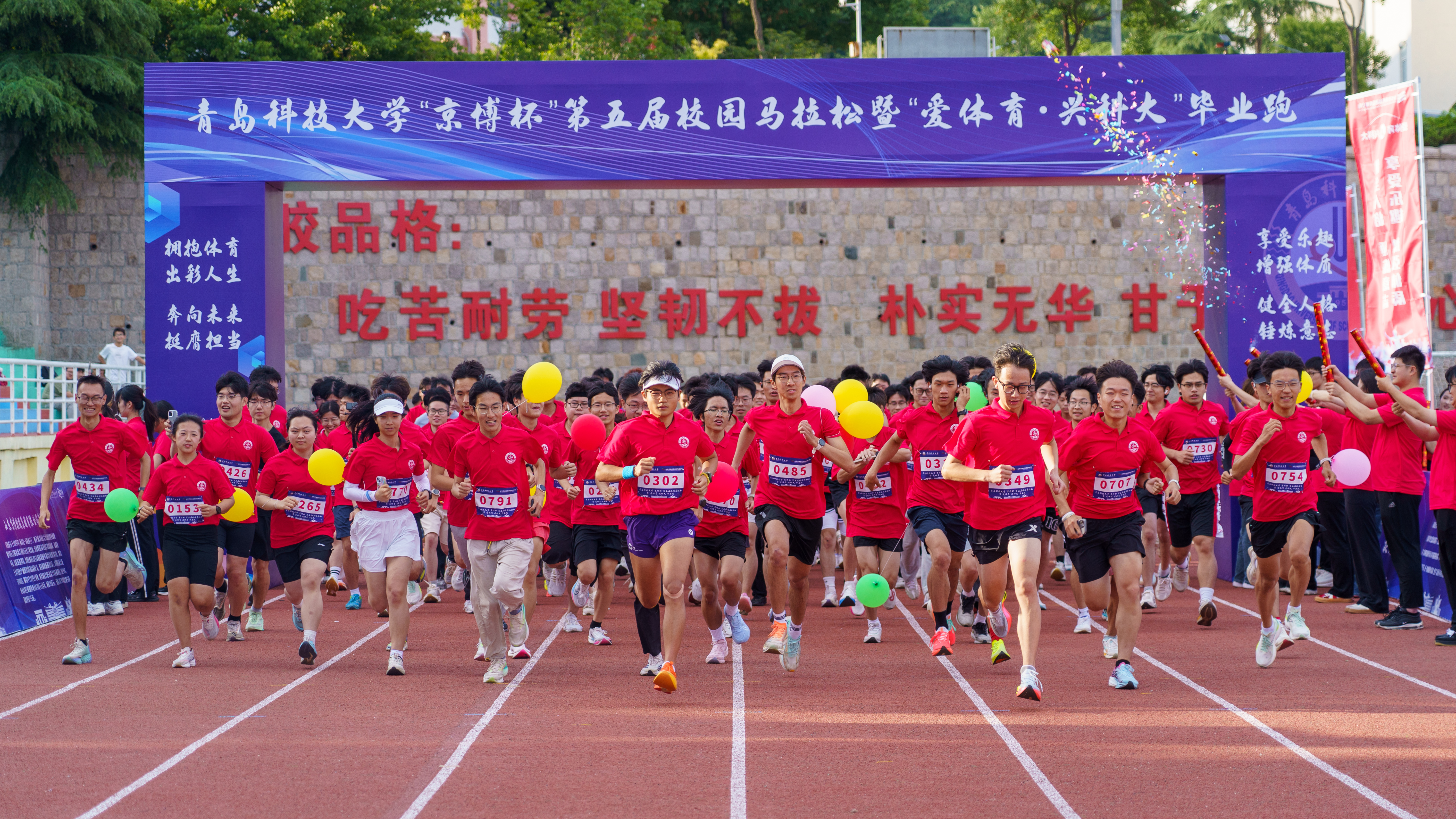 随着发令枪响,毕业生们冲出起跑线,赛道顿时变成蓝色、红色交织的河流。红蓝辉映的道旗迎风招展,“拥抱体育 出彩人生 畅享未来 无限精彩”“在青春的赛道上奋力奔跑 争取跑出当代青年的最好成绩”等充满期许的横幅高悬四周,是“奋斗青春”在科大校园最鲜活的注脚。毕业生们在师长和学弟学妹的陪伴下再览校园风景、回首校园时光,立志在青春的赛道上奋力奔跑,以实际行动表达对母校的深情与热爱,坚定“青春为中国式现代化挺膺担当”的理想信念。