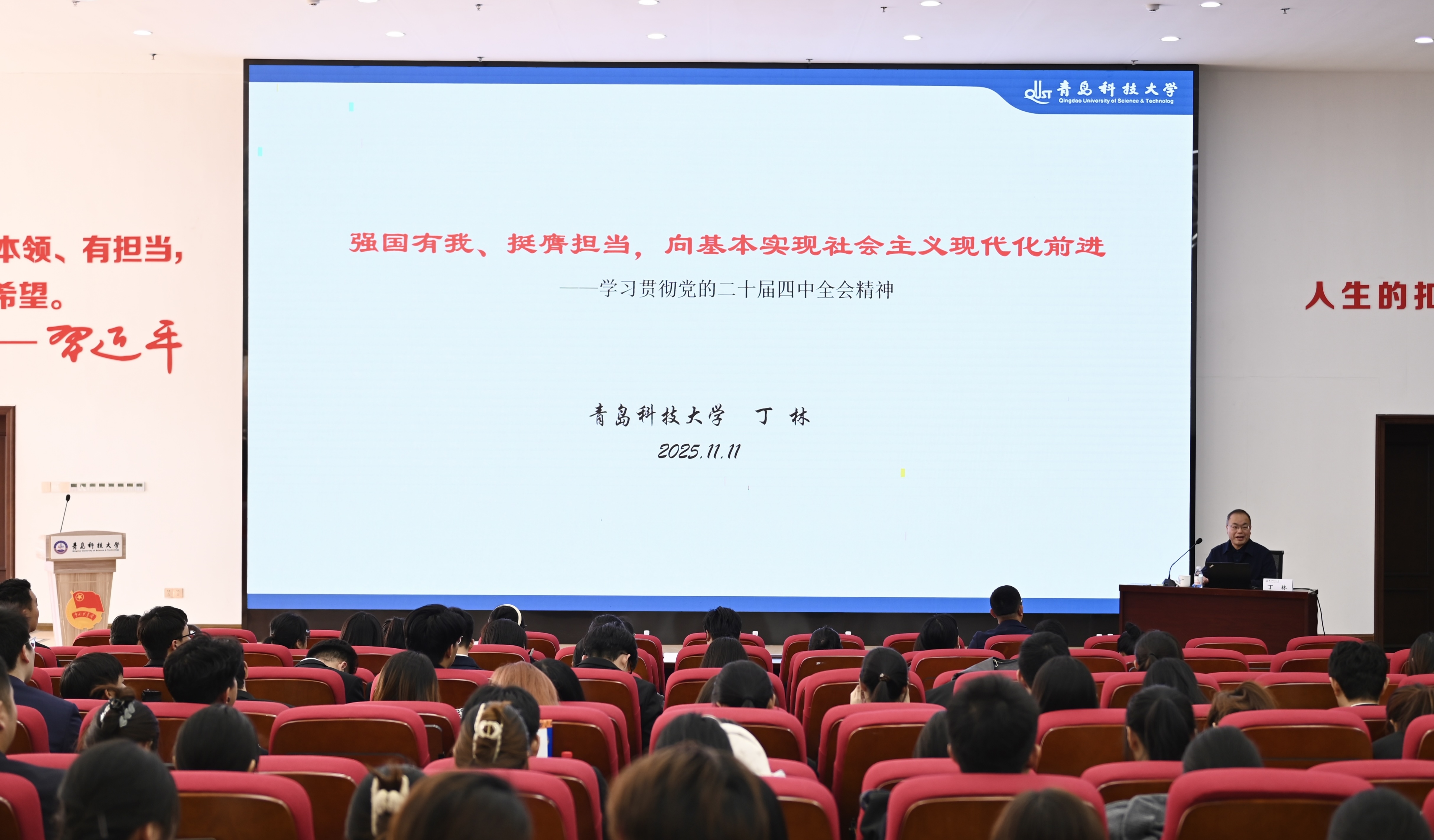 丁林为学校第18期“青马工程”培训班授旗,并以《强国有我、挺膺担当,向基本实现社会主义现代化前进》为题,为学员讲授“开班第一课”。丁林紧扣党的二十届四中全会精神,系统解读“十五五”时期经济社会发展七大主要目标,并围绕现代化产业体系建设、高水平科技自立自强、民生保障与共同富裕等重点任务进行深入阐释。他勉励全体学员,要做有理想、敢担当、能吃苦、肯奋斗的新时代好青年,将个人理想融入国家发展大局,在学科竞赛、科研攻关、社会实践中锤炼过硬本领,把青春热血挥洒在全面建设社会主义现代化国家的火热实践中。