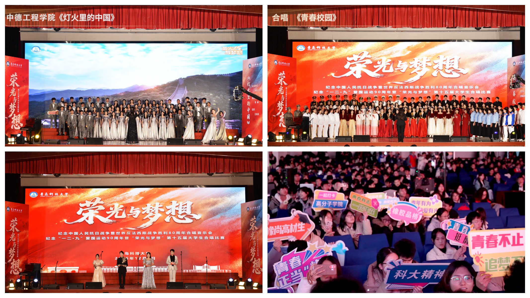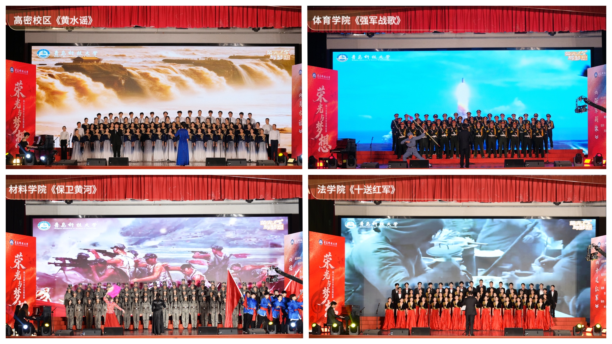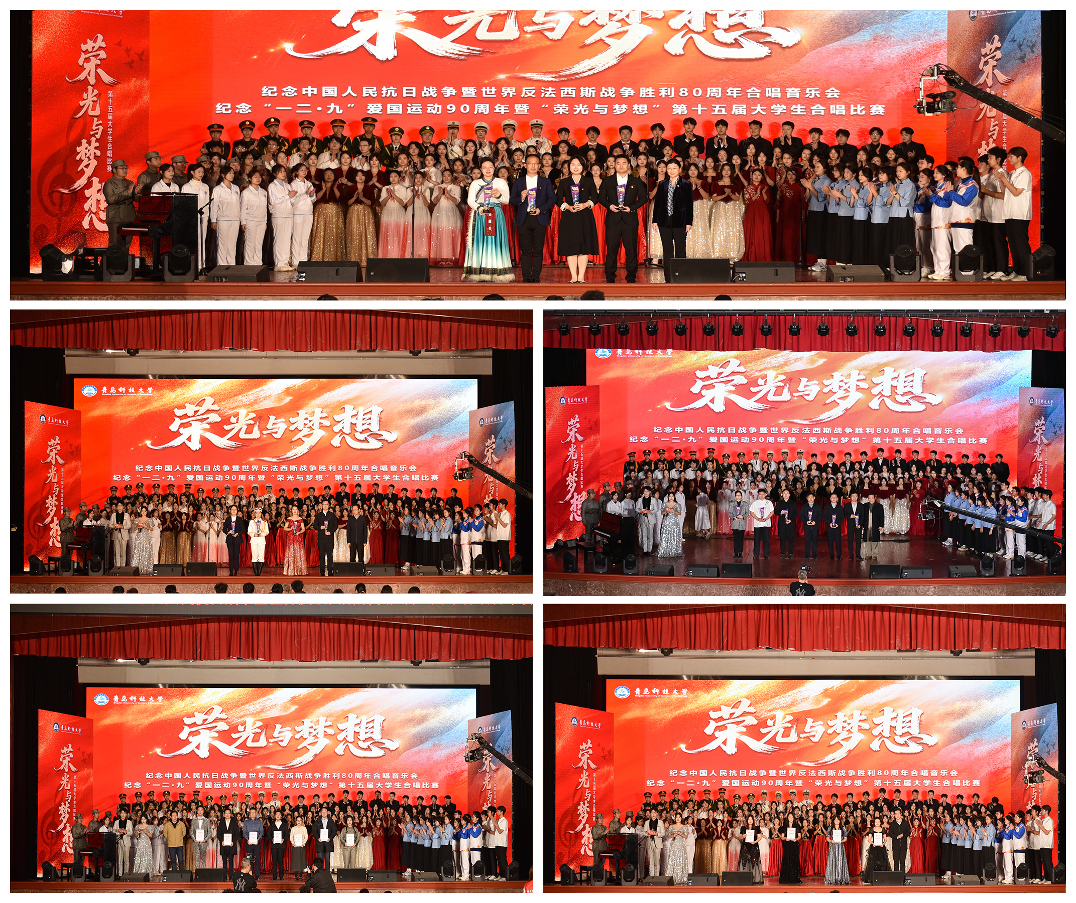 比赛现场,各队伍通过演唱《黄水谣》《强军战歌》《保卫黄河》《十送红军》《松花江上》《在太行山上》等曲目,聚焦新民主主义革命时期,用歌声再现民族危亡时刻的抗争精神与军民同心的深厚情谊。通过演唱《龙的传人》《我的祖国》《美丽草原我的家》《英雄赞歌》《歌唱祖国》等曲目,深情礼赞社会主义建设时期全国人民投身建设、奋发向上的精神风貌。通过演唱《我爱你,中国》《国家》《祖国不会忘记》《江山》《在灿烂阳光下》等曲目,展现改革开放和社会主义现代化建设时期的辉煌成就与奋斗者的奉献情怀。通过演唱《夜空中最亮的星》《万疆》《天路》《光亮》《灯火里的中国》等曲目,抒发立足中国特色社会主义新时代,青年学子投身强国建设、民族复兴伟业的坚定信念。最后,各学院合唱代表共同唱响校歌《青春校园》,用整齐嘹亮的歌声唱响爱校荣校主旋律,呈现出一堂“有魂、有料、有彩”的青春盛宴。