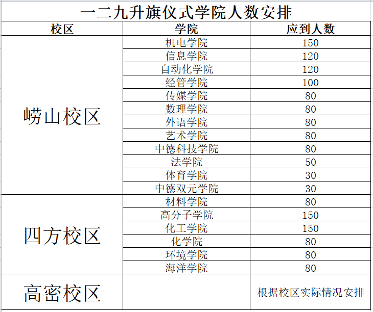 各学院学生代表(人数请见下图),以学院为单位按整齐方阵列队到达指定位置,非代表学生自愿参与。