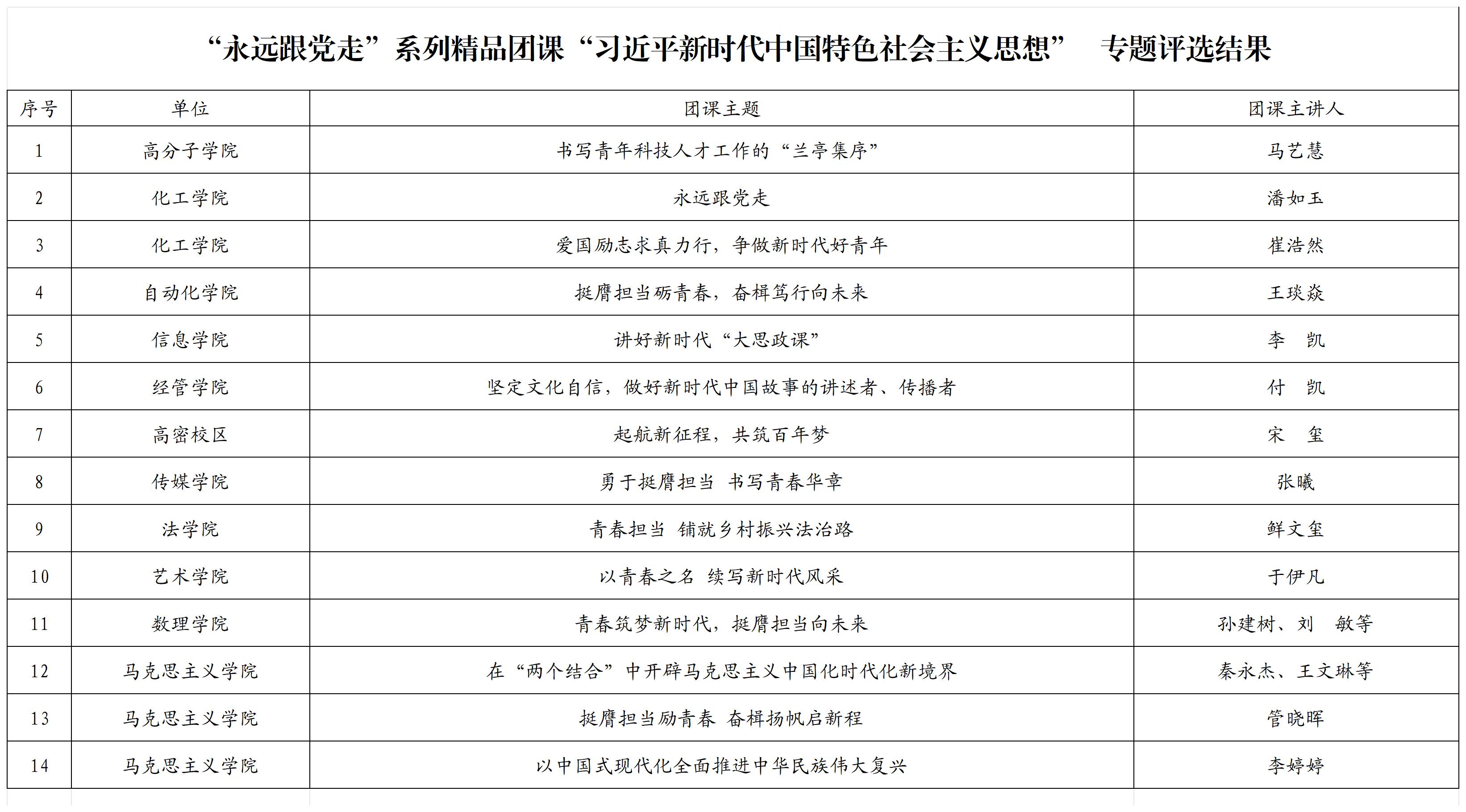 为深入学习贯彻习近平新时代中国特色社会主义思想,扎实推进团员和青年主题教育走实走深,更好地面向广大青年做好党的创新理论的“青年化”阐释工作,校团委开展了“永远跟党走”精品团课评选活动。经个人申报、学院(校区)推荐、综合评审等环节,评选出习近平新时代中国特色社会主义思想专题精品团课14期,现将评选结果公布如下: