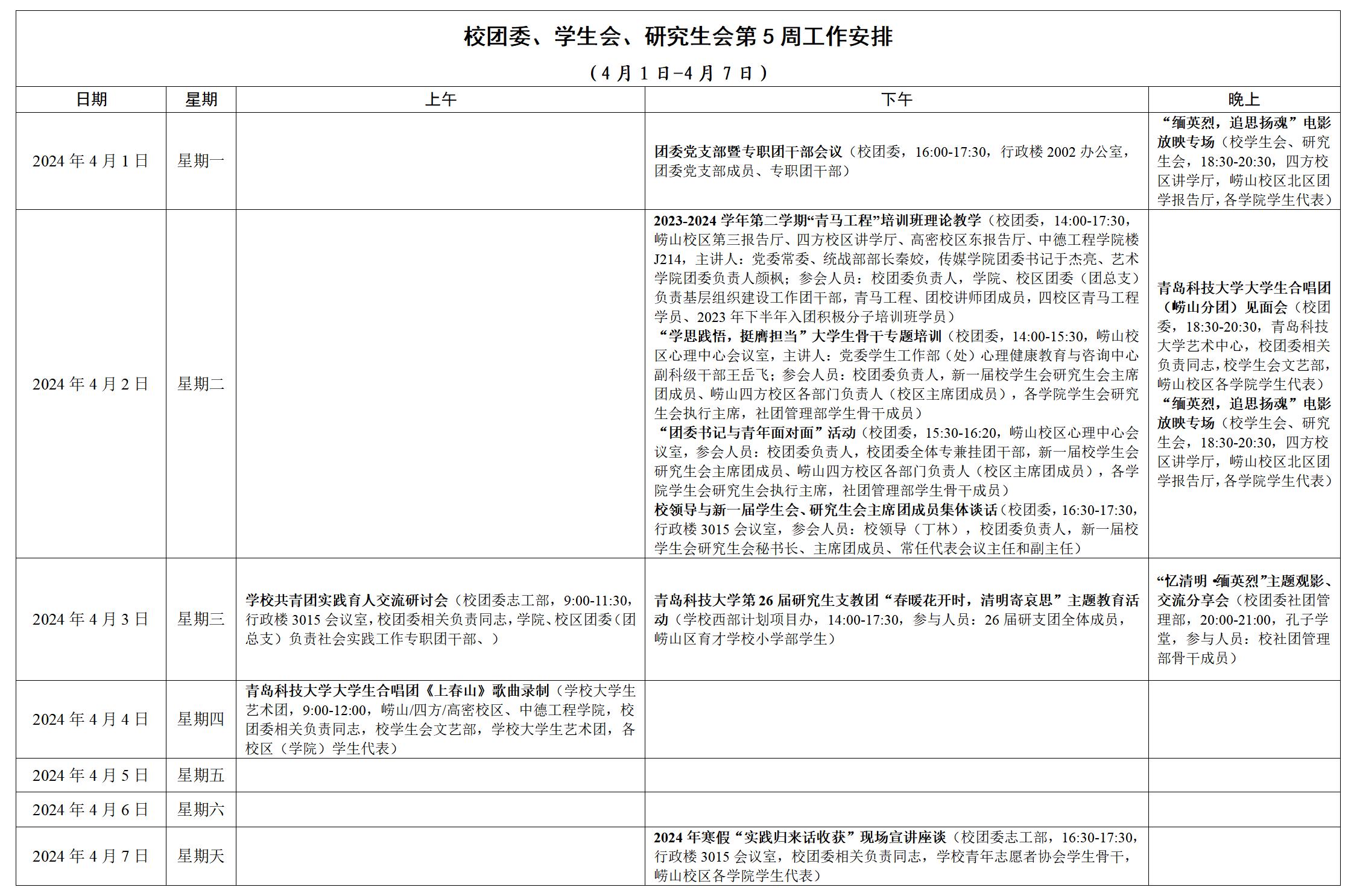 校团委、学生会、研究生会第5周工作安排