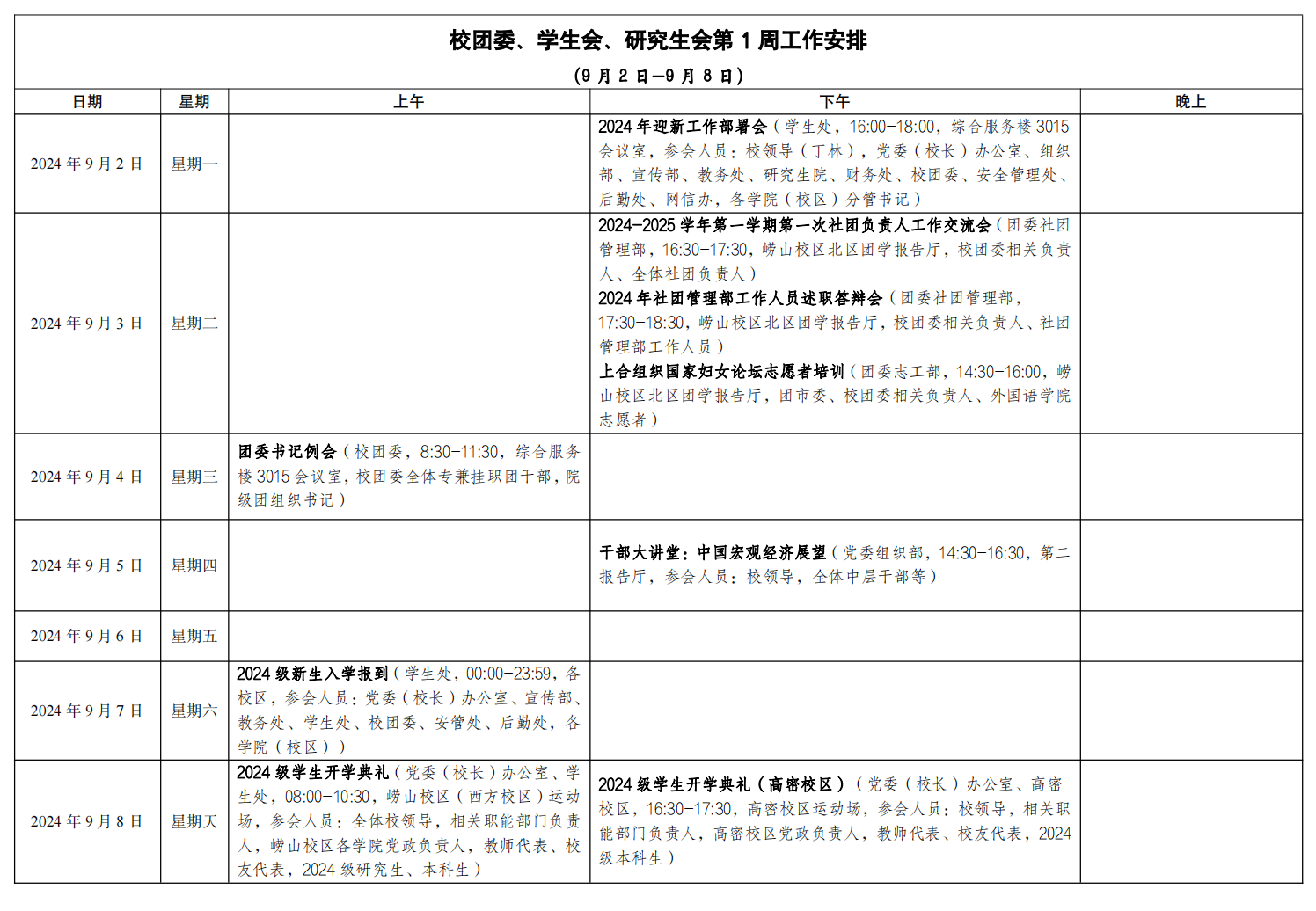 校团委、学生会、研究生会第1周工作安排