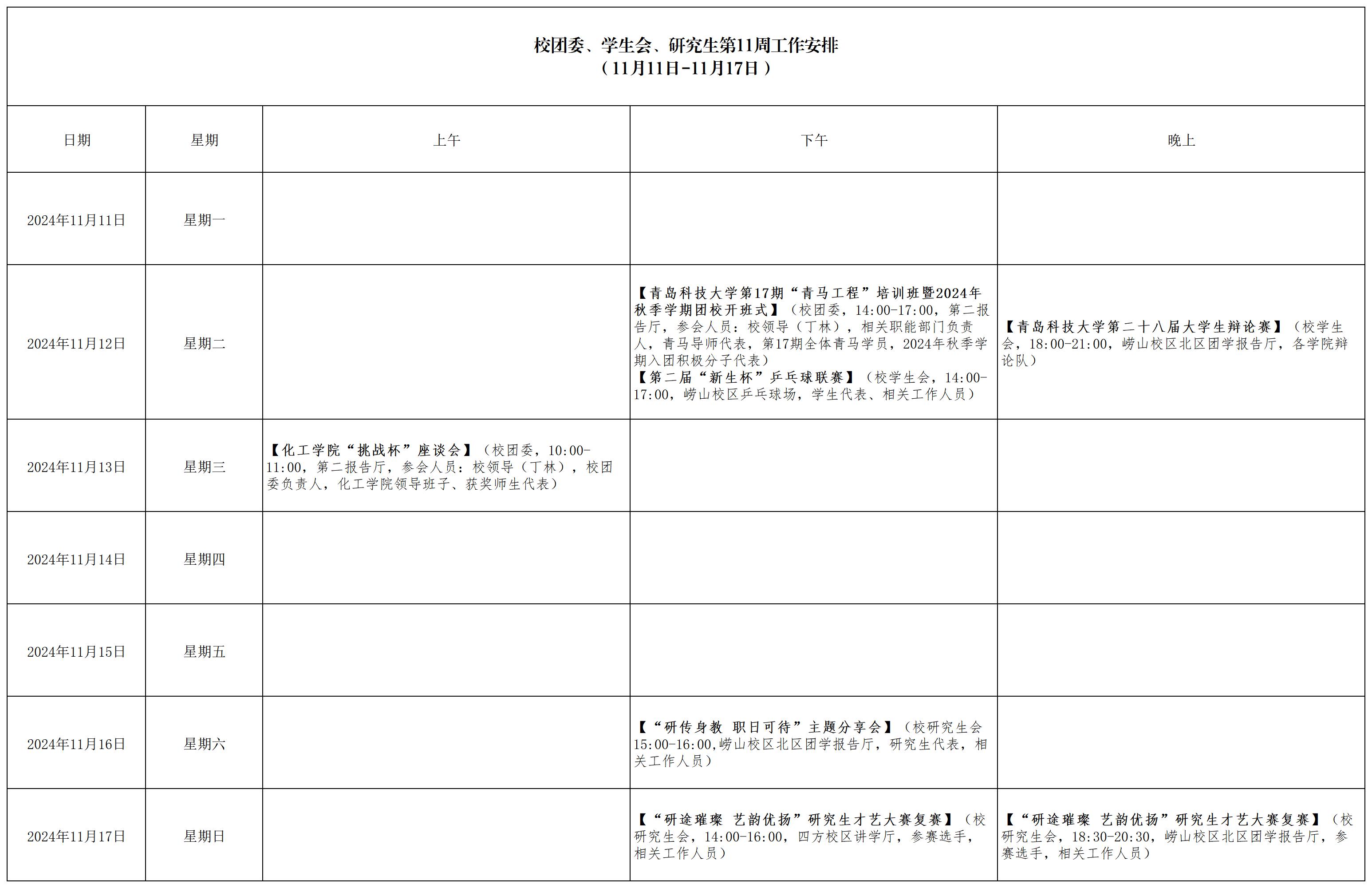 校团委、学生会、研究生会第11周工作安排