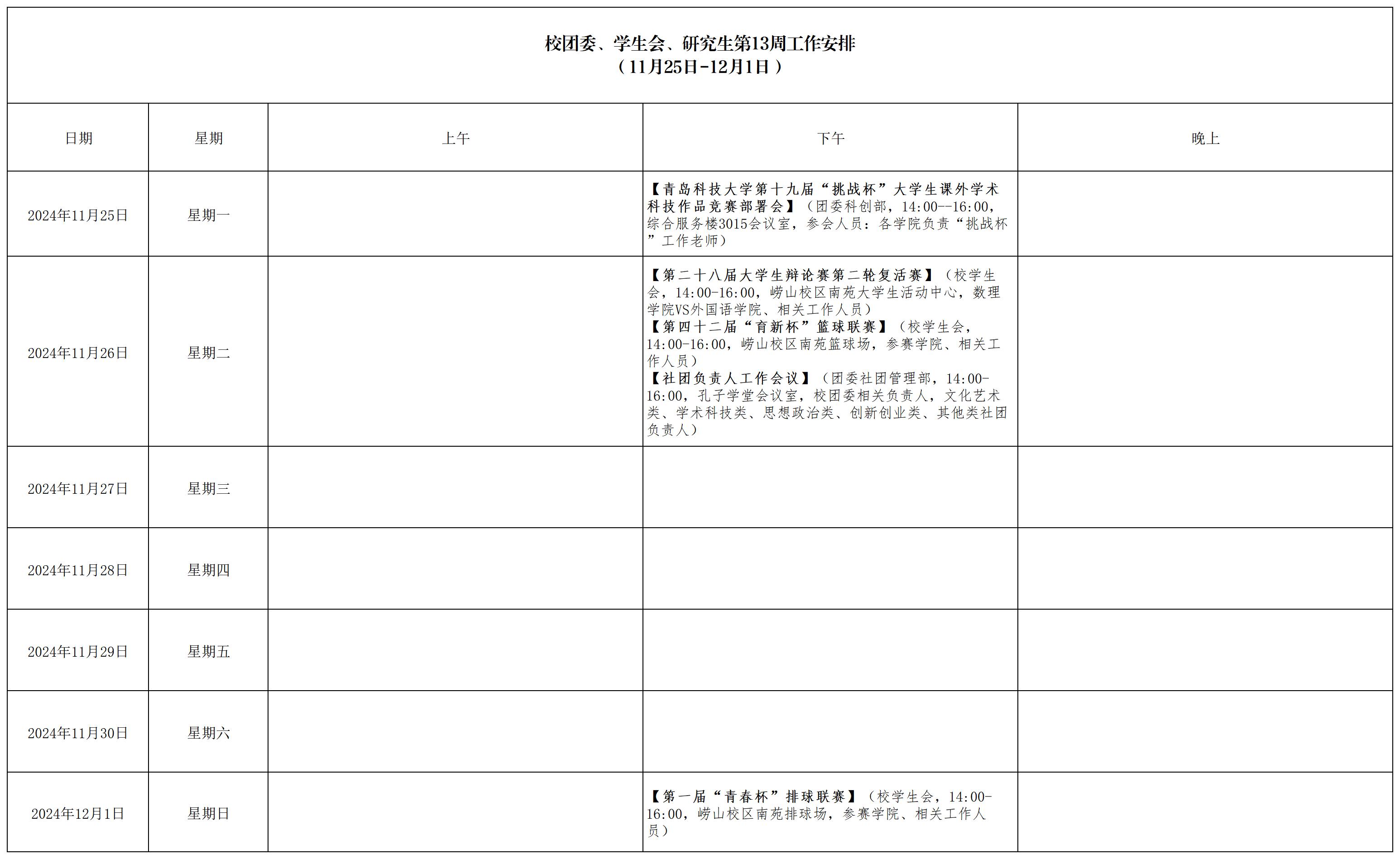 校团委、学生会、研究生会第13周工作安排