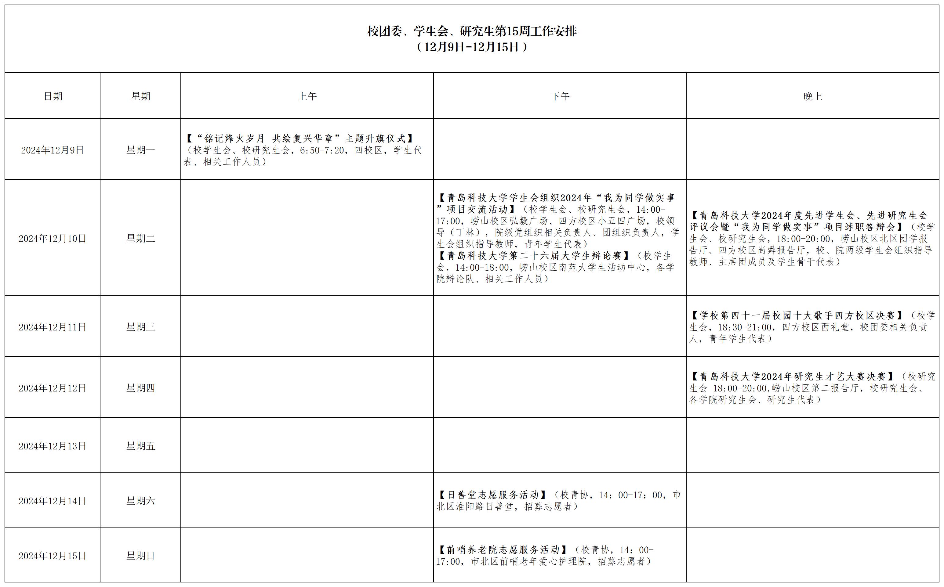 校团委、学生会、研究生会第15周工作安排