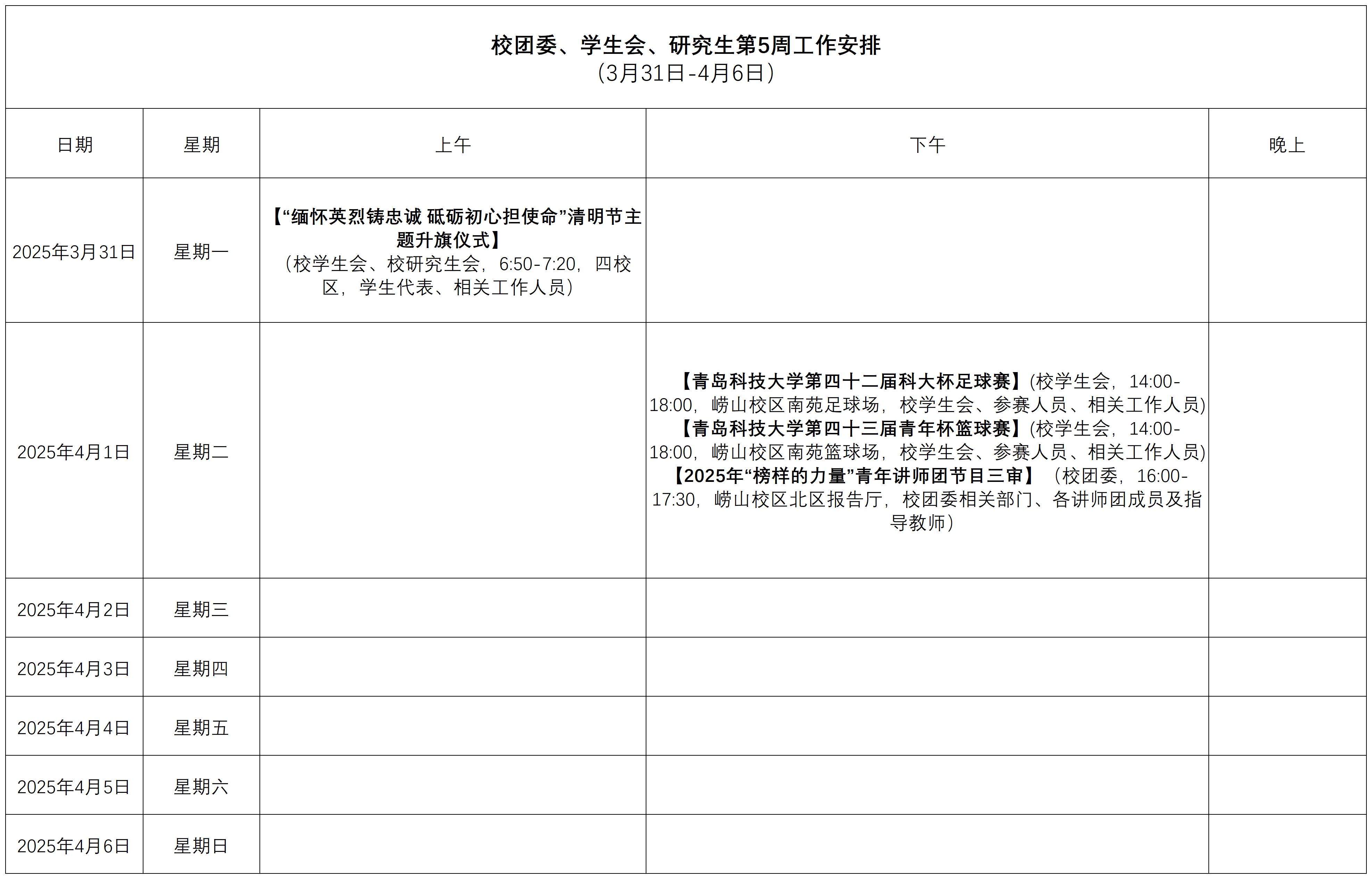 校团委、学生会、研究生第5周工作安排