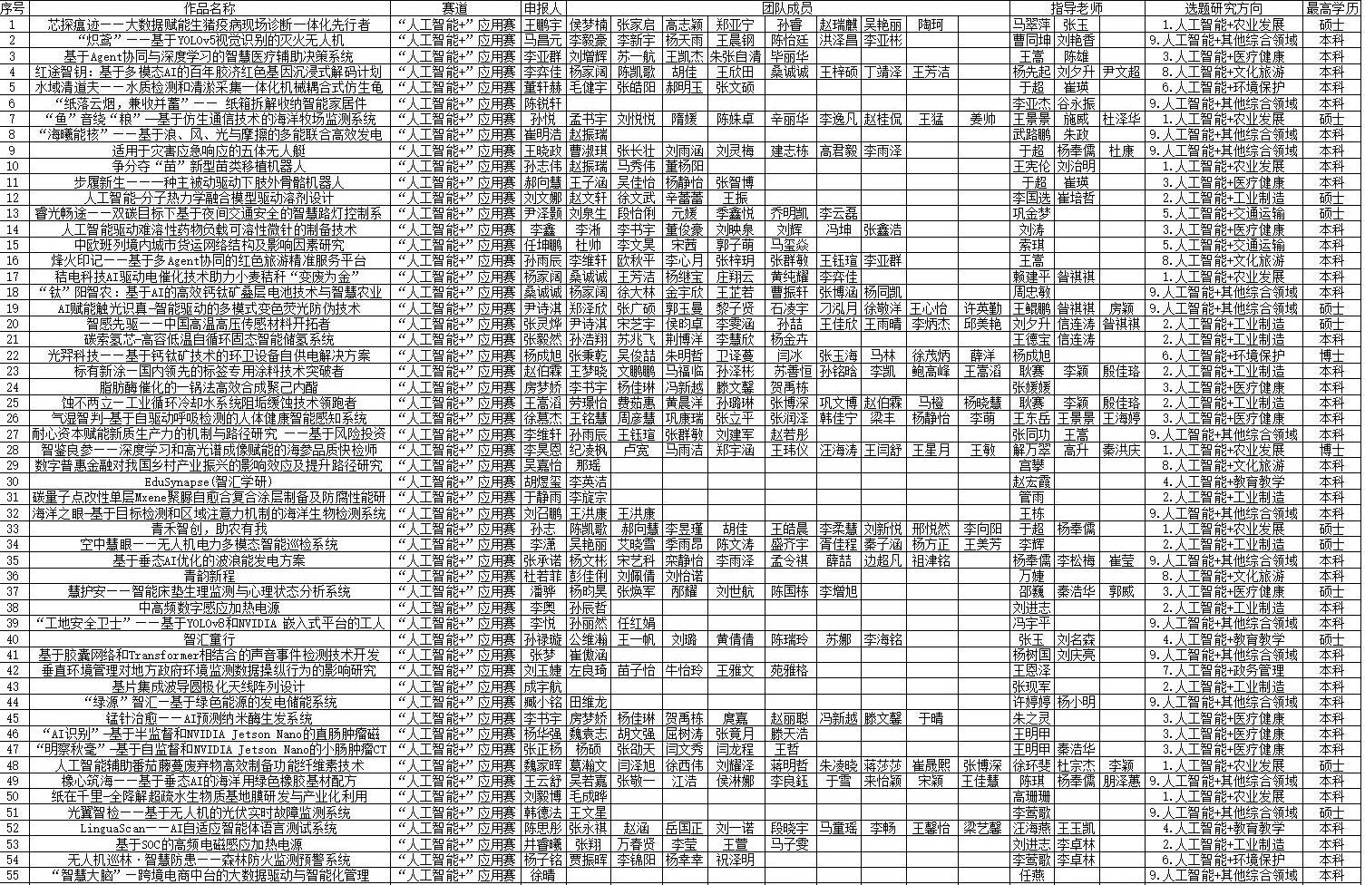 为深入学习贯彻党的二十大和二十届二中、三中全会精神,促进人工智能与经济发展、社会民生深度融合,培养一批既懂人工智能技术又熟悉行业发展的复合型人才,助力培育发展新质生产力,特举办第十九届“挑战杯”全国大学生课外学术科技作品竞赛“人工智能+”专项赛。现将学校推荐参赛项目予以公示。