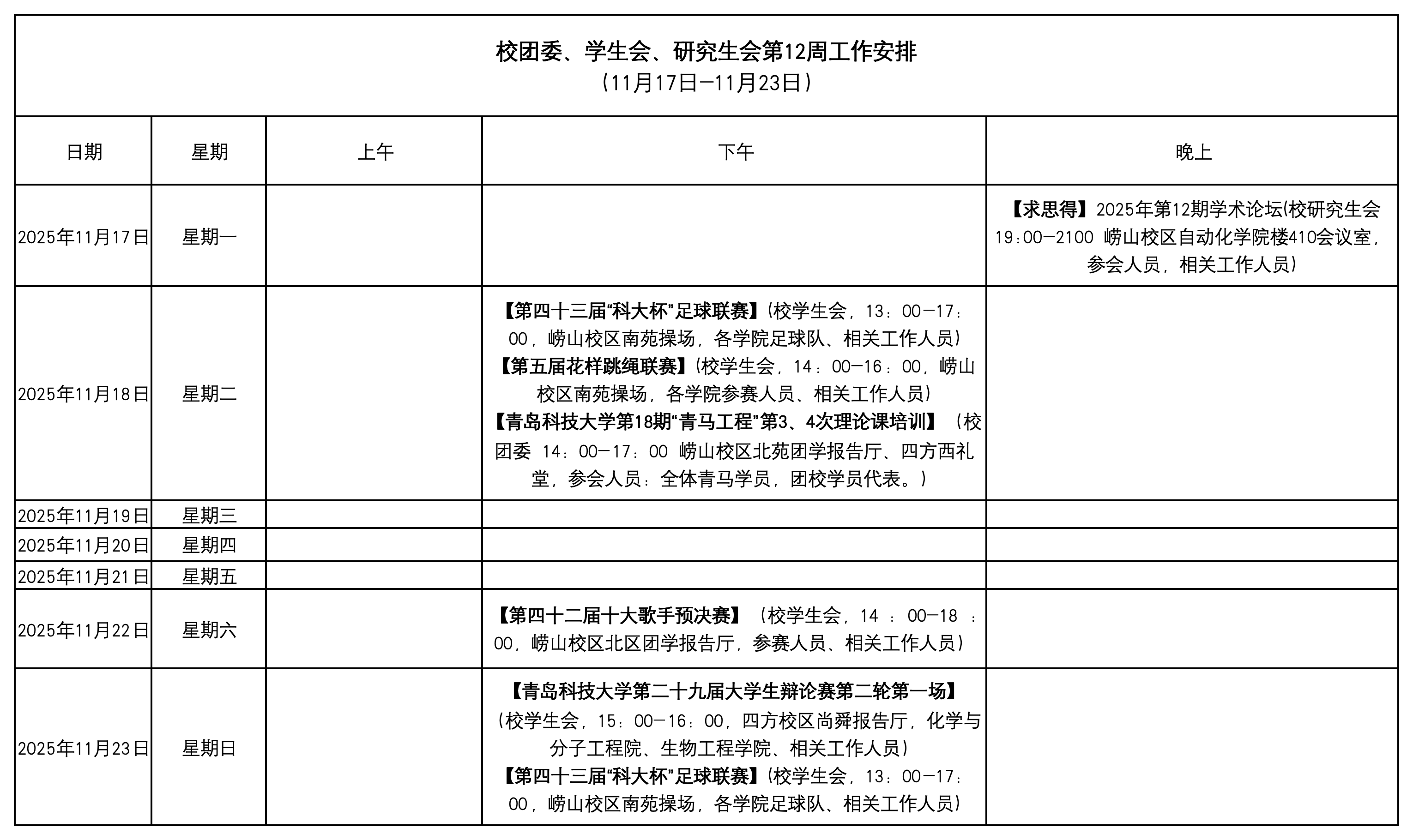 校团委、学生会、研究生会第12周工作安排