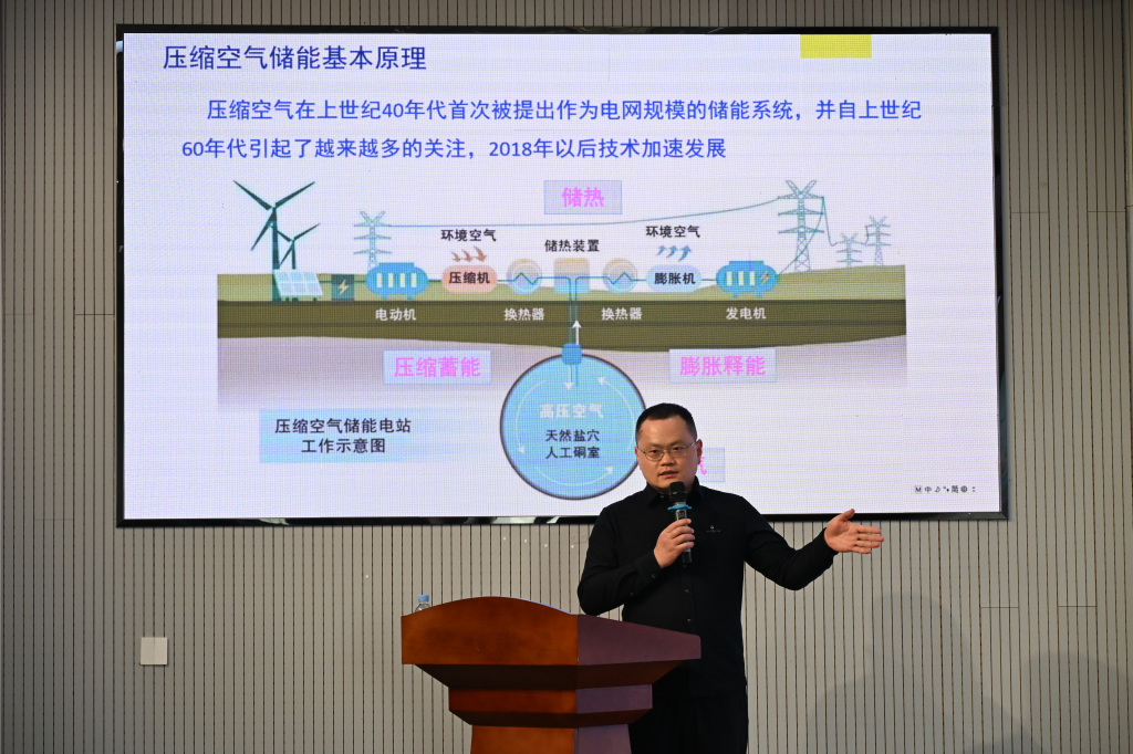 刘展以“先进气体压缩储能技术”为题,系统阐述先进气体压缩储能的核心路线与关键装备,分享团队在该领域的工程应用成果,并梳理了国内大型压缩气体储能示范项目的建设进展。他指出,先进气体压缩储能产业前景广阔,鼓励研究生要坚定科研自信,立足国家能源战略需求,以青科大为平台不断提升自我,为我国能源低碳转型与储能产业发展贡献力量。