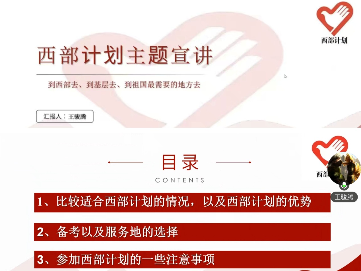 学院还特别邀请了西部计划志愿者2020级王骏腾同学作主题宣讲。他围绕服务期间的工作日常、生活保障及成长收获展开介绍,并提出三点建议:第一,精准定位,客观评估自身素质、能力与意愿,匹配服务岗位;第二,理性看待西部计划,明晰优势与挑战;第三,提前做好思想、心理、技能准备,强化安全纪律,保障服务有序。线上共有60多名同学积极参与,互动交流氛围热烈。