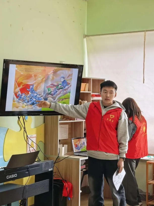 活动当天,志愿者们带着精心准备的红色经典绘本与文创小礼品走进教室,受到孩子们的热烈欢迎。简短自我介绍后,主题读书会正式拉开帷幕。彭雨涵、王鑫彤生动讲述《鸡毛信》的故事,将小英雄海娃机智勇敢、不畏艰险的形象刻画得鲜活生动,孩子们凝神倾听、赞叹不已。庞天博带来《闪闪的红星》,以潘冬子的成长故事,在孩子们心中种下爱国向上的种子。温心怡用浅显易懂的语言,讲述《雷锋的故事》,传递雷锋同志助人为乐、无私奉献的高尚品格,营造出温馨而庄重的学习氛围。