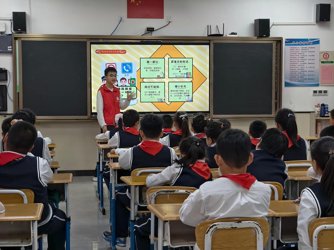 在核心知识讲授环节,团队依托信息学科背景,精心构建了涵盖隐私保护、防骗反诈、网络交友、健康游戏、文明言行及应急求助六大模块的课程体系。志愿者们将生硬的法律条文提炼为朗朗上口的“安全童谣”,重点拆解了“免费送皮肤”“中奖短信”等小学生高频遭遇的网络骗局,通过“不乱说、不乱填、不私加、不私见”等具体准则,全方位填补了青少年的网络安全知识盲区。