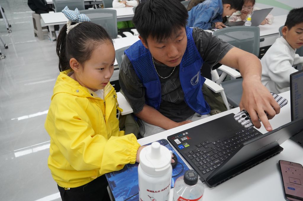 理论宣讲环节结束后,志愿者组织开展编程实操体验活动。志愿者细致讲解Scratch操作规范及创作思路,在志愿者的悉心带领下,学生们近距离接触编程工具,亲手体验创作过程,真切感受前沿科技的魅力,体会科学探索带来的乐趣。