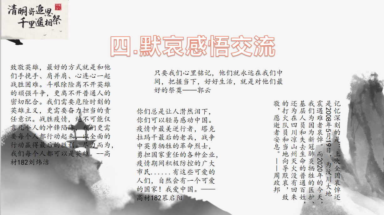 今年的四月四号是一个很特殊的日子,为纪念逝世先烈,纪念为新冠肺炎疫情斗争逝世的同胞们,MILE米乐集团高材182班深刻践行国家指示,开展了“云祭英烈”线上默哀活动,进行集体哀悼,强化同学们对于英雄的敬意和为国家献力的决心。