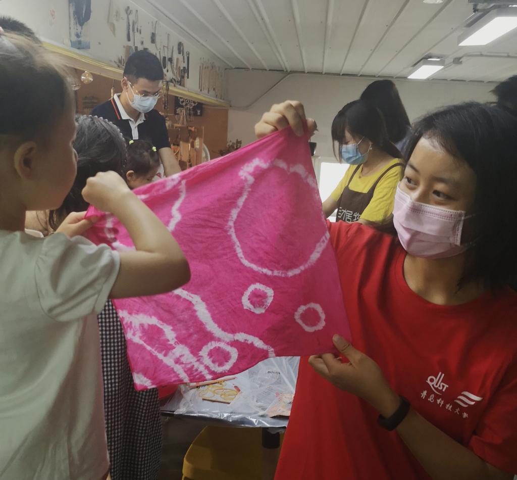 此次体验课主要为幼儿园的小朋友开展,因此素材主要选择了安全易操作的道具,包括白色手帕、橡皮筋、乒乓球、短木棍等,来吸引小朋友的注意力。首先队员们讲解了扎染的步骤,并用事先做好的成品激发他们的兴趣。在队员们耐心的讲解下,小朋友们很快便掌握了扎结的方法。经过简单的“扎、染、拆”三个步骤,顺利制作了简单的扎染手帕。当亲手拆开到自己的成品时,小朋友们都表现的十分开心。同时在制作过程中,队员们和小朋友都感受到了扎染的魅力,不到最后一步,永远不知道布料会被染出什么纹理,这也是自然和变化带来的惊喜。