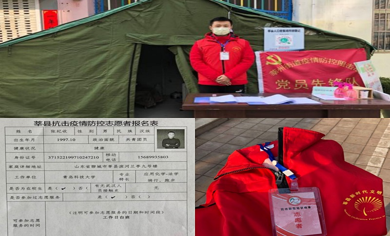 博20级班长张纪收,在2021年寒假报名成为莘县疫情防控的一名志愿者,主要负责中高地区返乡人员的报备、登记及核查任务;早在2020年,张纪收就签下请战书,主动要求前往一线防疫岗投入“战斗”,承担了所负责社区“四大行动”专项排查任务等多项一线工作。目前,张纪收同学累计管控值勤100余小时,宣传劝导1500余人次,登记外来人口300多余次,对社区电梯消毒120多余次。张纪收弘扬了新时代大学生能奋斗、甘奉献的精神,获得了社区工作人员的一致好评。