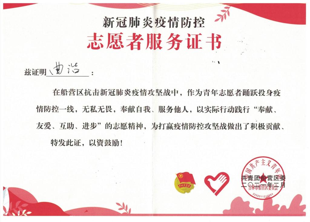 曲浩同学寒假离校返乡后,面对疫情防控的严峻形势,他积极响应号召,成为一名一线志愿工作者。与街道办一线巡防员并肩作战,在街道下辖各无物业老旧小区进行消毒工作,前往街道下辖各小区卡口巡防及下发粘贴各类文件及公告。负责外来人员隔离工作,具体包括外来人员的隔离及解除,监控询访相关人员身体状况,负责保障隔离人员的生活需求,如代买运送生活物资和药品,倾倒生活垃圾等等,圆满完成疫情排查保障各项工作,工作效率和工作质量高,获得街道及社区和广大党员群众认可。